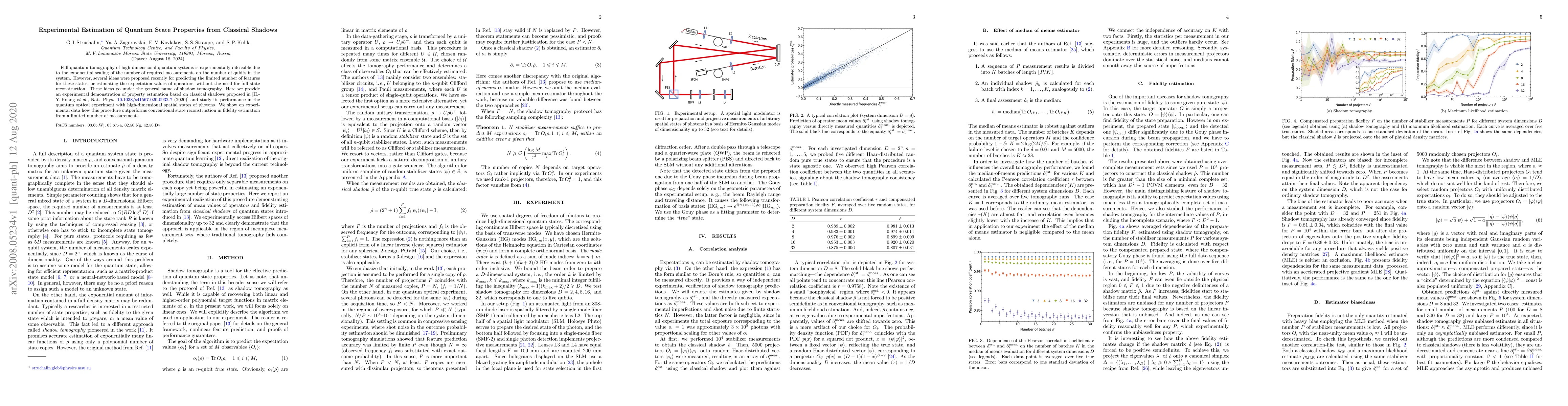 This paper experimentally demonstrates the use of classical shadows for estimating quantum state properties, showing that it outperforms conventional full state reconstruction in fidelity estimation with fewer measurements. The study focuses on high-dimensional spatial states of photons in quantum optical experiments.