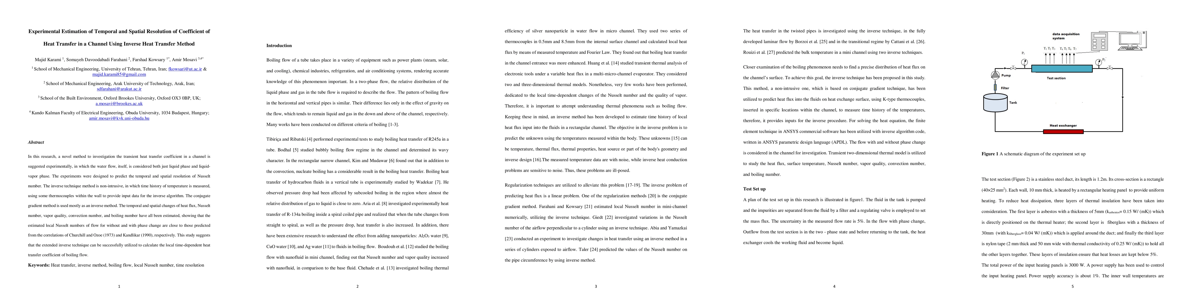 In this research, a novel method to investigation the transient heat transfer coefficient in a channel is suggested experimentally, in which the water flow, itself, is considered both just liquid phase and liquid-vapor phase. The experiments were designed to predict the temporal and spatial resolution of Nusselt number. The inverse technique method is non-intrusive, in which time history of temperature is measured, using some thermocouples within the wall to provide input data for the inverse algorithm. The conjugate gradient method is used mostly as an inverse method. The temporal and spatial changes of heat flux, Nusselt number, vapor quality, convection number, and boiling number have all been estimated, showing that the estimated local Nusselt numbers of flow for without and with phase change are close to those predicted from the correlations of Churchill and Ozoe (1973) and Kandlikar (1990), respectively. This study suggests that the extended inverse technique can be successfully utilized to calculate the local time-dependent heat transfer coefficient of boiling flow.