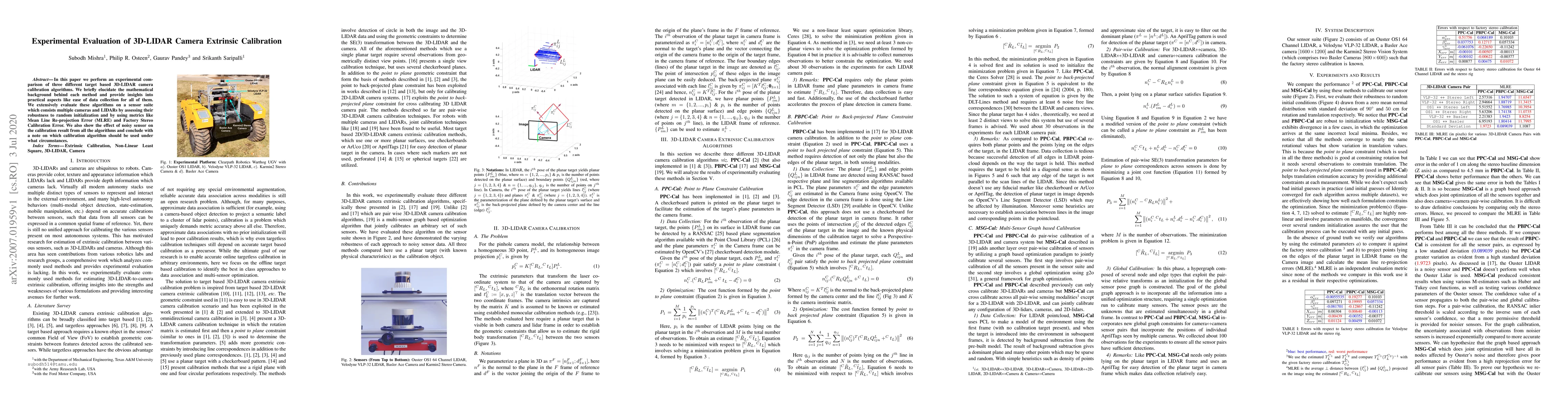 In this paper we perform an experimental comparison of three different target based 3D-LIDAR camera calibration algorithms. We briefly elucidate the mathematical background behind each method and provide insights into practical aspects like ease of data collection for all of them. We extensively evaluate these algorithms on a sensor suite which consists multiple cameras and LIDARs by assessing their robustness to random initialization and by using metrics like Mean Line Re-projection Error (MLRE) and Factory Stereo Calibration Error. We also show the effect of noisy sensor on the calibration result from all the algorithms and conclude with a note on which calibration algorithm should be used under what circumstances.