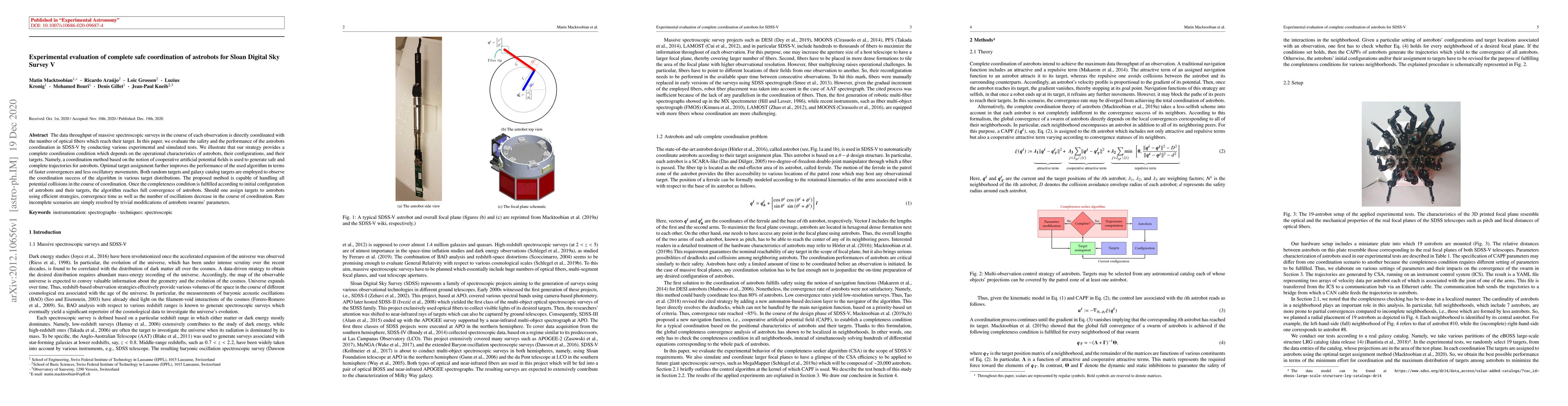 The data throughput of massive spectroscopic surveys in the course of each observation is directly coordinated with the number of optical fibers which reach their target. In this paper, we evaluate the safety and the performance of the astrobots coordination in SDSS-V by conducting various experimental and simulated tests. We illustrate that our strategy provides a complete coordination condition which depends on the operational characteristics of astrobots, their configurations, and their targets. Namely, a coordination method based on the notion of cooperative artificial potential fields is used to generate safe and complete trajectories for astrobots. Optimal target assignment further improves the performance of the used algorithm in terms of faster convergences and less oscillatory movements. Both random targets and galaxy catalog targets are employed to observe the coordination success of the algorithm in various target distributions. The proposed method is capable of handling all potential collisions in the course of coordination. Once the completeness condition is fulfilled according to initial configuration of astrobots and their targets, the algorithm reaches full convergence of astrobots. Should one assign targets to astrobots using efficient strategies, convergence time as well as the number of oscillations decrease in the course of coordination. Rare incomplete scenarios are simply resolved by trivial modifications of astrobots swarms' parameters.