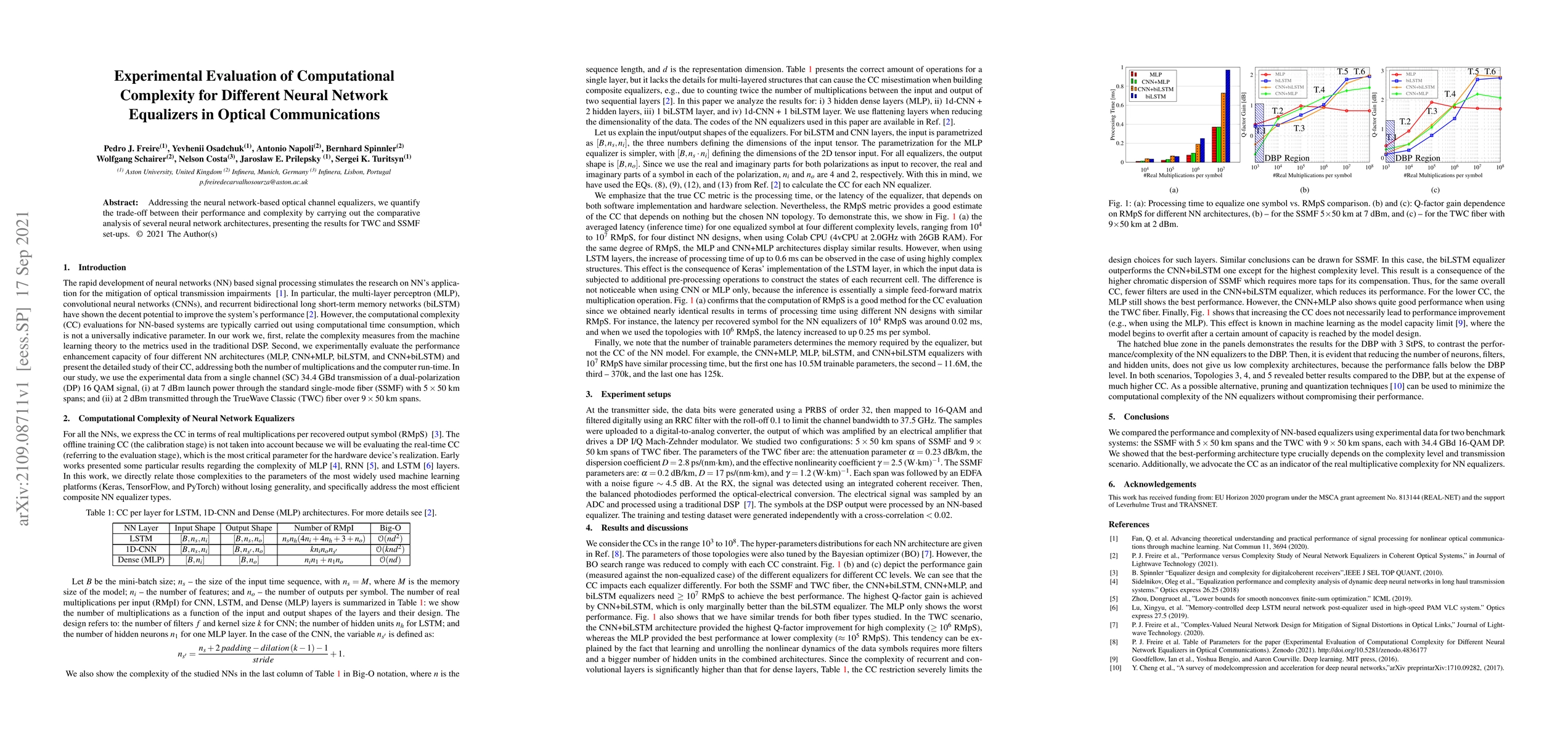 Addressing the neural network-based optical channel equalizers, we quantify the trade-off between their performance and complexity by carrying out the comparative analysis of several neural network architectures, presenting the results for TWC and SSMF set-ups.