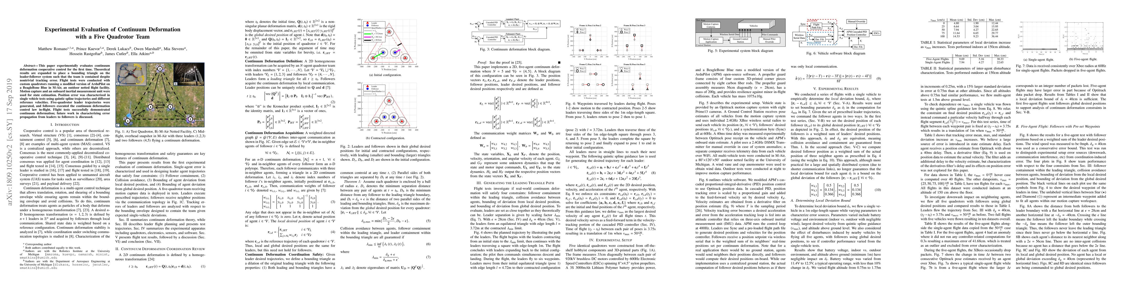This paper experimentally evaluates continuum deformation cooperative control for the first time. Theoretical results are expanded to place a bounding triangle on the leader-follower system such that the team is contained despite nontrivial tracking error. Flight tests were conducted with custom quadrotors running a modified version of ArduPilot on a BeagleBone Blue in M-Air, an outdoor netted flight facility. Motion capture and an onboard inertial measurement unit were used for state estimation. Position error was characterized in single vehicle tests using quintic spline trajectories and different reference velocities. Five-quadrotor leader trajectories were generated, and followers executed the continuum deformation control law in-flight. Flight tests successfully demonstrated continuum deformation; future work in characterizing error propagation from leaders to followers is discussed.