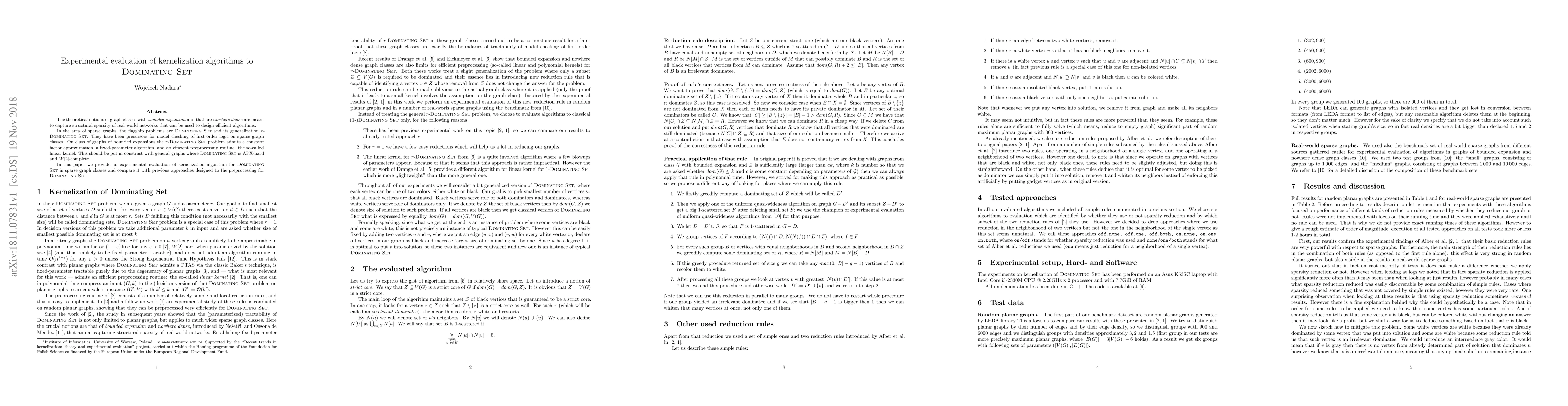 The theoretical notions of graph classes with bounded expansion and that are nowhere dense are meant to capture structural sparsity of real world networks that can be used to design efficient algorithms. In the area of sparse graphs, the flagship problems are Dominating Set and its generalization r-Dominating Set. They have been precursors for model checking of first order logic on sparse graph classes. On class of graphs of bounded expansions the r-Dominating Set problem admits a constant factor approximation, a fixed-parameter algorithm, and an efficient preprocessing routine: the so-called linear kernel. This should be put in constrast with general graphs where Dominating Set is APX-hard and W[2]-complete. In this paper we provide an experimental evaluation of kernelization algorithm for Dominating Set in sparse graph classes and compare it with previous approaches designed to the preprocessing for Dominating Set.