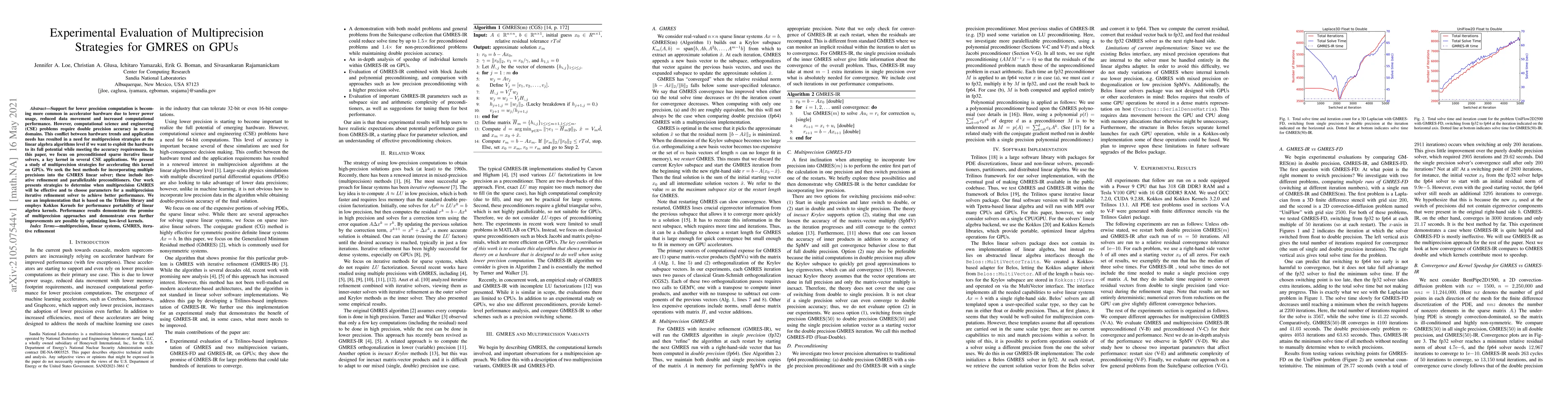 This paper investigates multiprecision strategies to enhance the performance of the GMRES linear solver on GPUs, addressing the conflict between hardware efficiency and the need for double precision accuracy in computational science. The study evaluates iterative refinement and parallelizable preconditioners, demonstrating potential performance gains and identifying optimization opportunities for low-level kernels.