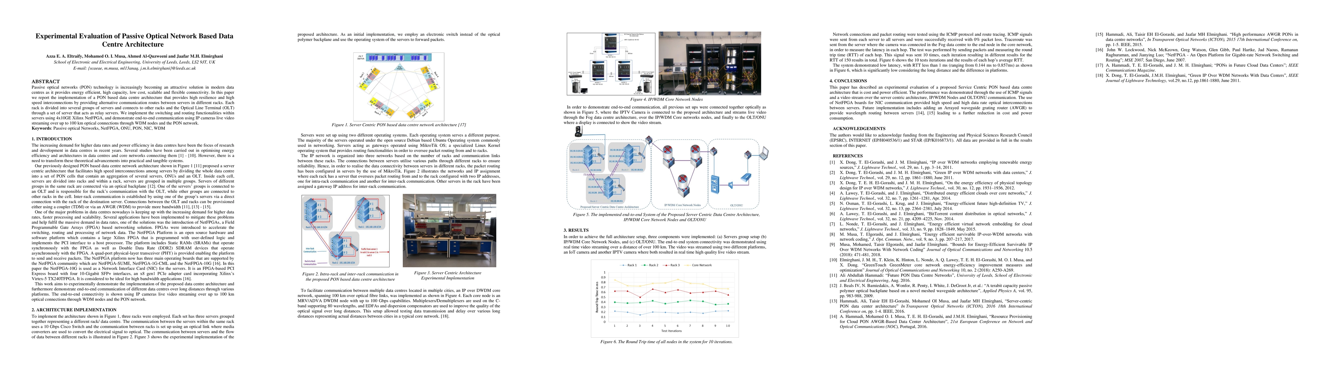 This paper evaluates a Passive Optical Network (PON) based data centre architecture, showcasing energy-efficient, scalable connectivity with high resilience. The implementation uses 4x10GE Xilinx NetFPGA for switching and routing, demonstrating successful live video streaming over 100 km optical connections.