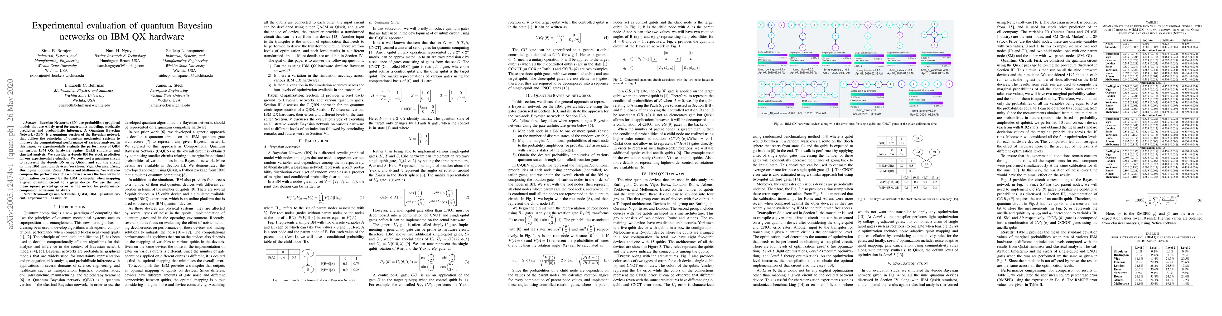 This paper evaluates the performance of Quantum Bayesian Networks (QBN) on various IBM QX quantum hardware compared to a classical simulator and classical analysis. Experiments involve a 4-node Bayesian Network for stock prediction, with performance measured by root mean square percentage error across nine IBM quantum devices and four optimization levels.