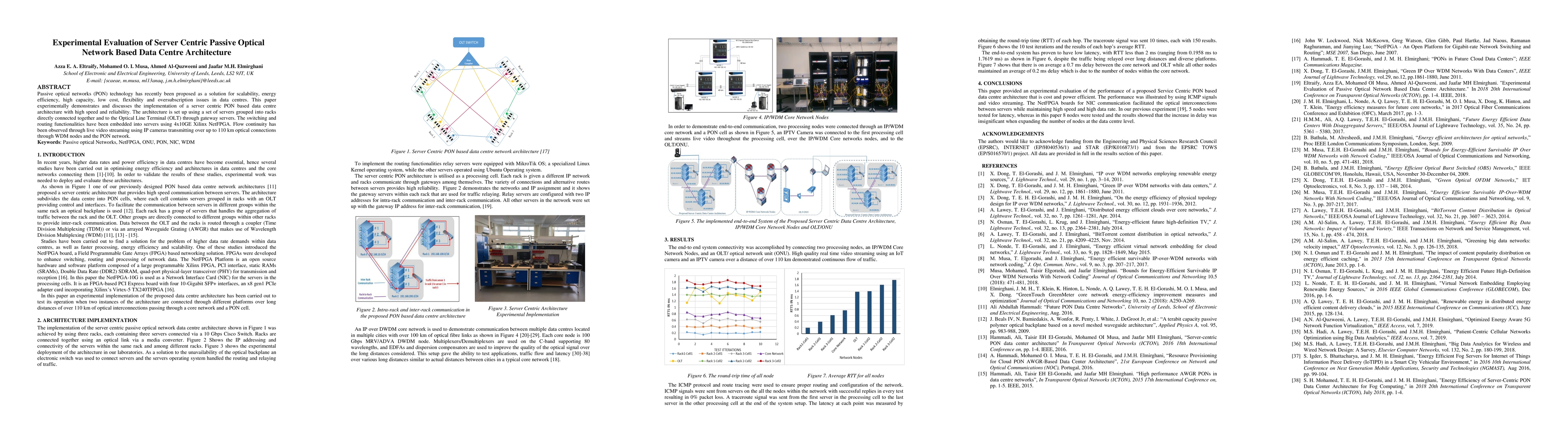 This paper experimentally evaluates a server centric passive optical network (PON) based data centre architecture, demonstrating scalability, energy efficiency, and high-speed data transmission. The architecture integrates servers with 4x10GE Xilinx NetFPGA for switching, achieving reliable flow continuity over long distances via live video streaming.