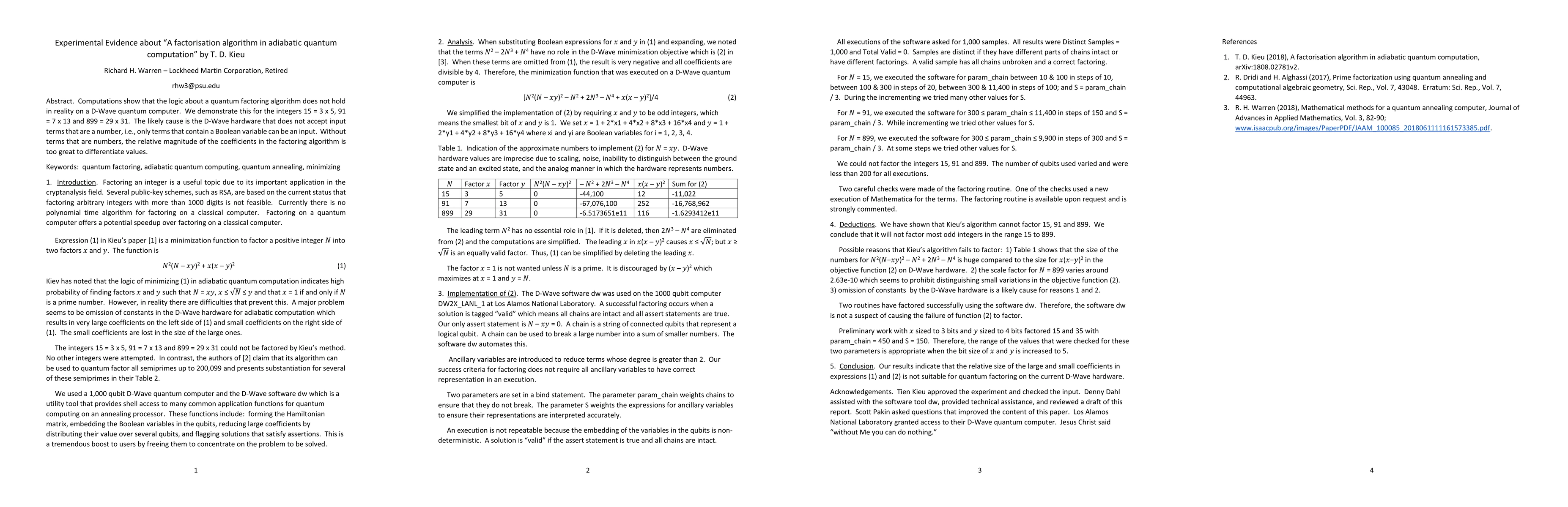 Researchers tested a quantum factoring algorithm on D-Wave computers and found it did not work as expected due to hardware limitations. The algorithm requires coefficients that can differentiate between numbers, which is not possible with the current D-Wave setup.