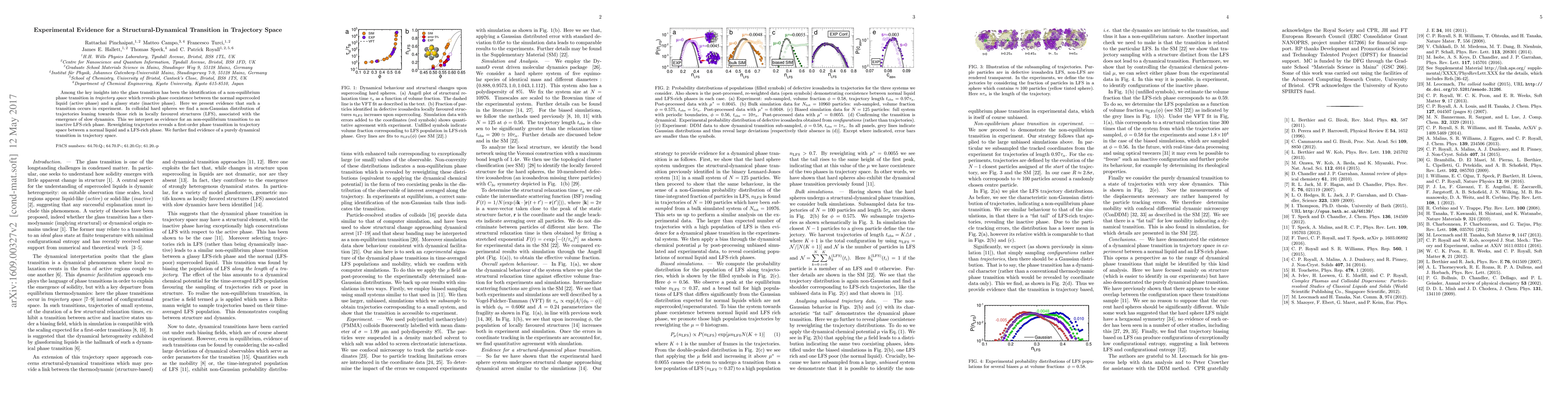 Among the key insights into the glass transition has been the identification of a non-equilibrium phase transition in trajectory space which reveals phase coexistence between the normal supercooled liquid (active phase) and a glassy state (inactive phase). Here we present evidence that such a transition occurs in experiment. In colloidal hard spheres we find a non-Gaussian distribution of trajectories leaning towards those rich in locally favoured structures (LFS), associated with the emergence of slow dynamics. This we interpret as evidence for an non-equilibrium transition to an inactive LFS-rich phase. Reweighting trajectories reveals a first-order phase transition in trajectory space between a normal liquid and a LFS-rich phase. We further find evidence of a purely dynamical transition in trajectory space.