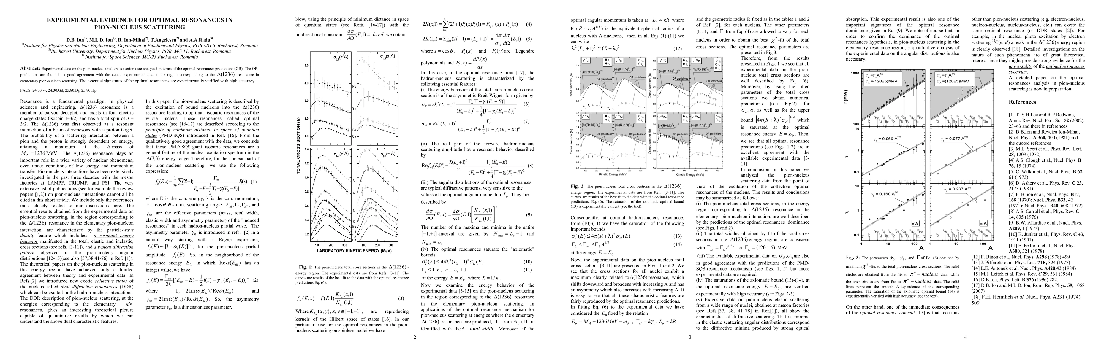 Experimental data on the pion-nucleus total cross sections are analyzed in terms of the optimal resonances predictions (OR). The OR-predictions are found in a good agreement with the actual experimental data in the region corresponding to the Delta(1236) resonance in elementary pi-N scattering. The essential signatures of the optimal resonances are experimentally verified with high accuracy.