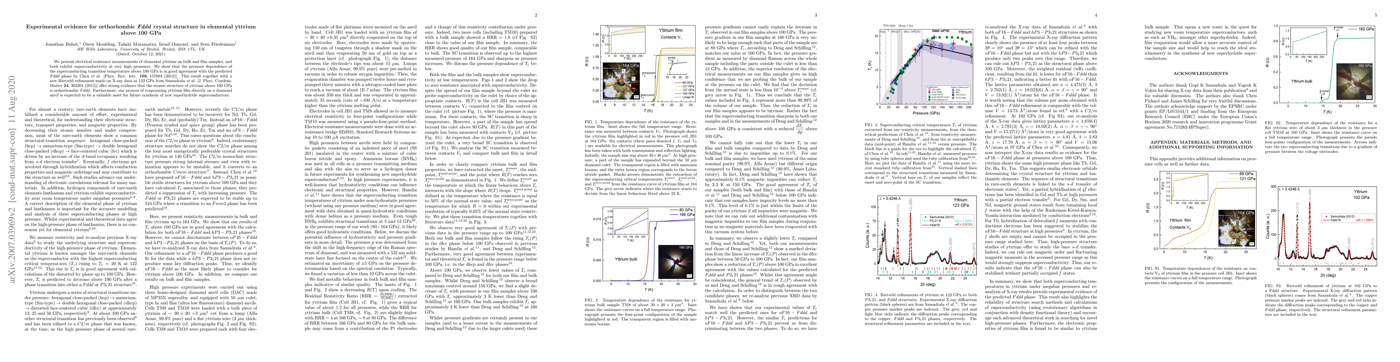 We present electrical resistance measurements of elemental yttrium on bulk and film samples, and both exhibit superconductivity at very high pressures. We show that the pressure dependence of the superconducting transition temperature above 100 GPa is in good agreement with the predicted Fddd phase by Chen et al. [Phys. Rev. lett. 109, 157004 (2012)]. This result together with a new Rietveld refinement made on X-ray data at 123 GPa from Samudrala et al. [J. Phys. Condens. Matter 24, 362201 (2012)] offer strong evidence that the atomic structure of yttrium above 100 GPa is orthorhombic Fddd. Furthermore, our process of evaporating yttrium film directly on a diamond anvil is expected to be a valuable asset for future synthesis of new superhydride superconductors.