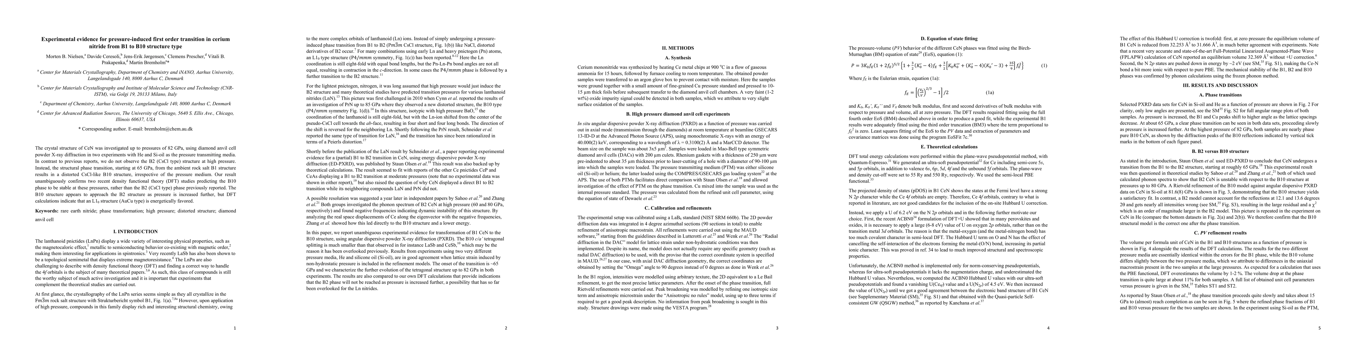 This study reveals a pressure-induced first-order transition in cerium nitride from the B1 to B10 structure type at 65 GPa, contrary to previous reports of a B2 phase. DFT predictions confirm the stability of the B10 phase over the B2 phase at high pressures.
