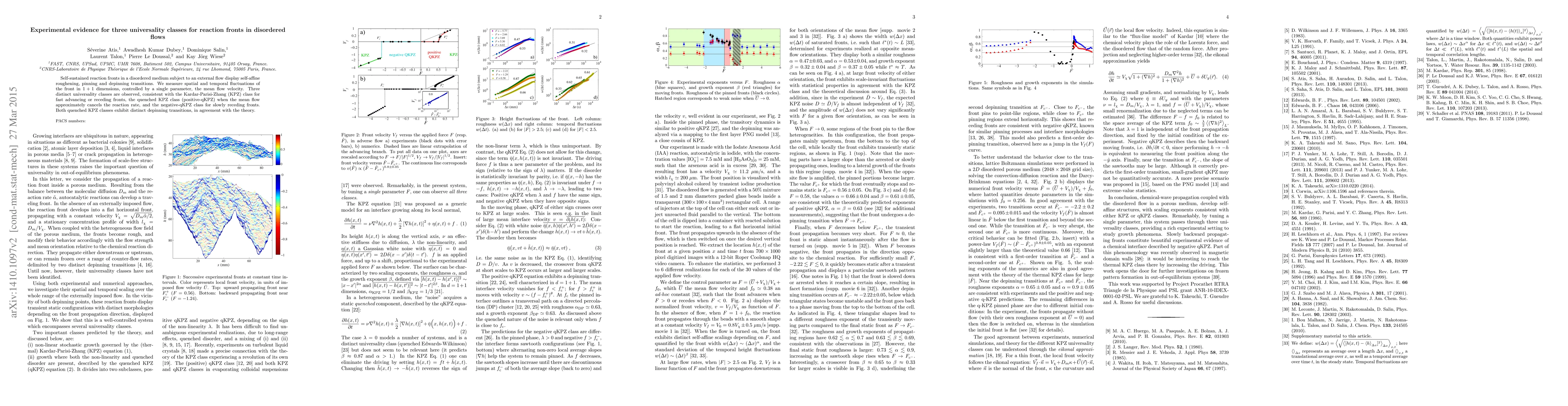 Self-sustained reaction fronts in a disordered medium subject to an external flow display self-affine roughening, pinning and depinning transitions. We measure spatial and temporal fluctuations of the front in $1+1$ dimensions, controlled by a single parameter, the mean flow velocity. Three distinct universality classes are observed, consistent with the Kardar-Parisi-Zhang (KPZ) class for fast advancing or receding fronts, the quenched KPZ class (positive-qKPZ) when the mean flow approximately cancels the reaction rate, and the negative-qKPZ class for slowly receding fronts. Both quenched KPZ classes exhibit distinct depinning transitions, in agreement with the theory.
