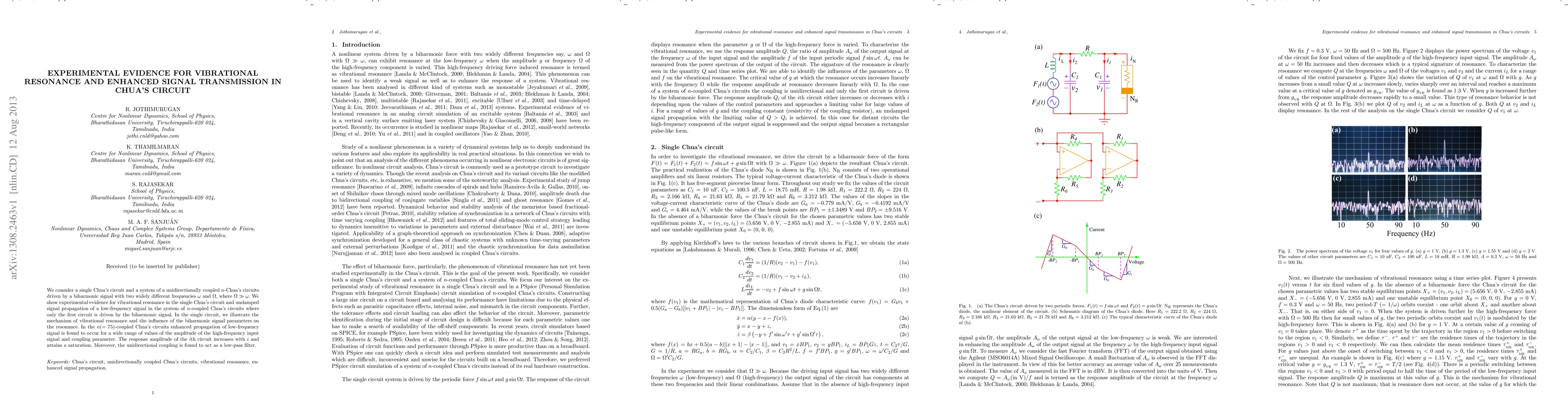 We consider a single Chua's circuit and a system of a unidirectionally coupled n-Chua's circuits driven by a biharmonic signal with two widely different frequencies \omega and \Omega, where \Omega >> \omega. We show experimental evidence for vibrational resonance in the single Chua's circuit and undamped signal propagation of a low-frequency signal in the system of n-coupled Chua's circuits where only the first circuit is driven by the biharmonic signal. In the single circuit, we illustrate the mechanism of vibrational resonance and the influence of the biharmonic signal parameters on the resonance. In the n(= 75)-coupled Chua's circuits enhanced propagation of low-frequency signal is found to occur for a wide range of values of the amplitude of the high-frequency input signal and coupling parameter. The response amplitude of the ith circuit increases with i and attains a saturation. Moreover, the unidirectional coupling is found to act as a low-pass filter.