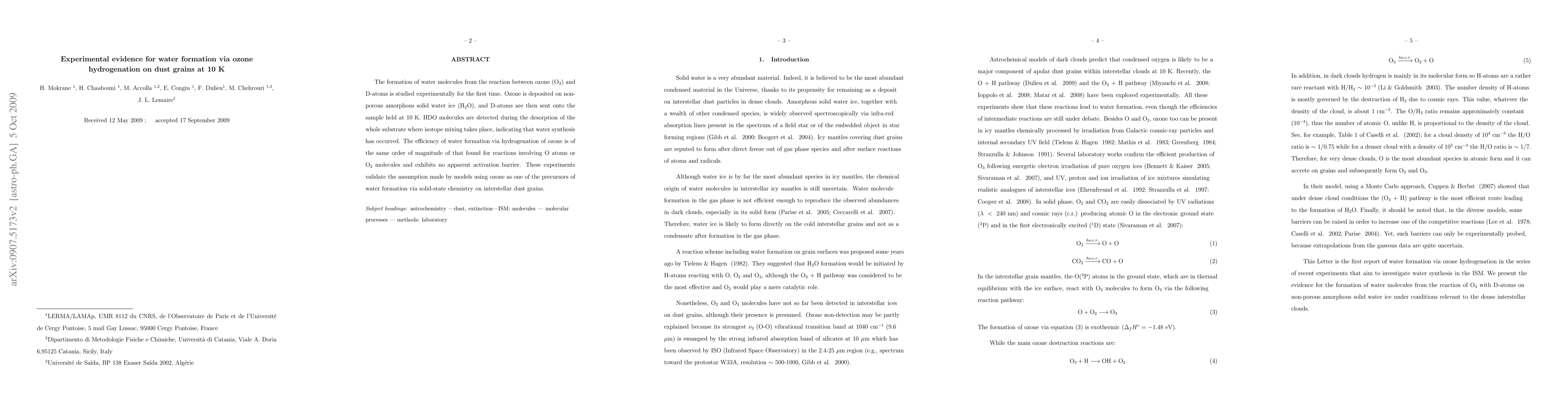 This study experimentally confirms the formation of water via ozone hydrogenation on dust grains at 10 K, detecting HDO molecules and showing no activation barrier. These findings support models that propose ozone as a precursor for water synthesis in interstellar environments.