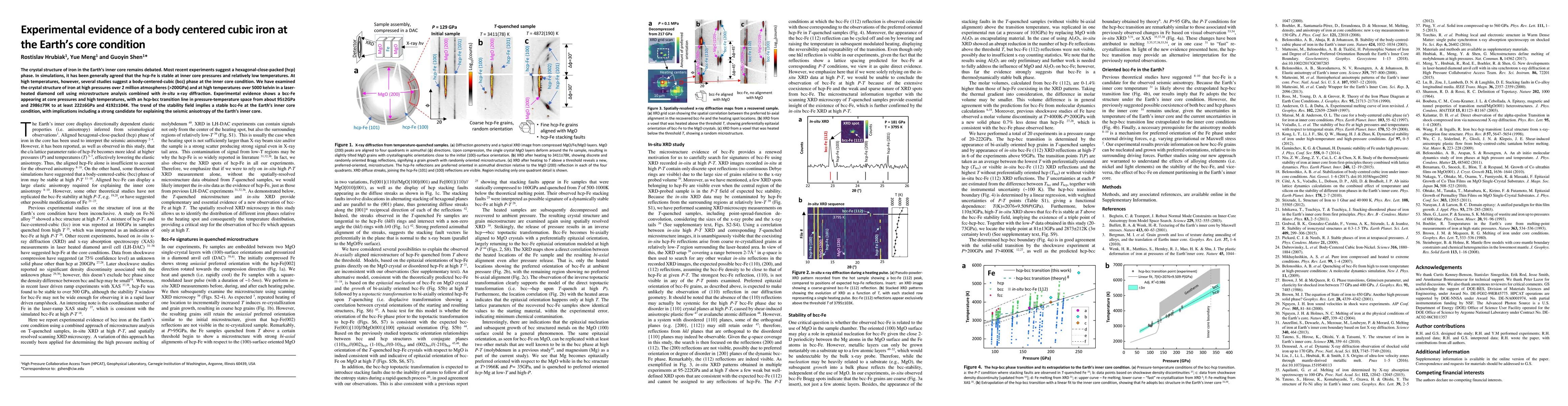 This study provides experimental evidence for a body-centered cubic (bcc) iron phase at the Earth's inner core conditions, using high-pressure and high-temperature laser-heated diamond anvil cell experiments. The findings suggest that bcc-Fe is stable at pressures exceeding 200GPa and temperatures over 5000 Kelvin, indicating its presence at the core and potentially explaining seismic anisotropy.