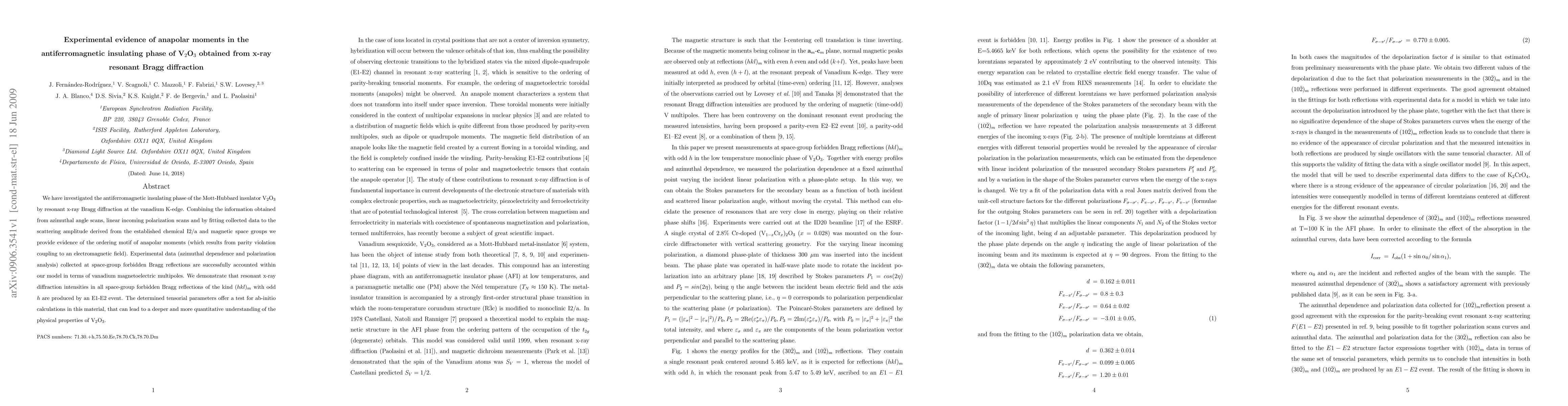 This paper presents experimental evidence of anapolar moments in the antiferromagnetic insulating phase of V$_2$O$_3$ using resonant x-ray Bragg diffraction. The study reveals the ordering motif through azimuthal and polarization analysis, demonstrating that forbidden Bragg reflections arise from an E1-E2 event, providing new insights for ab-initio calculations.