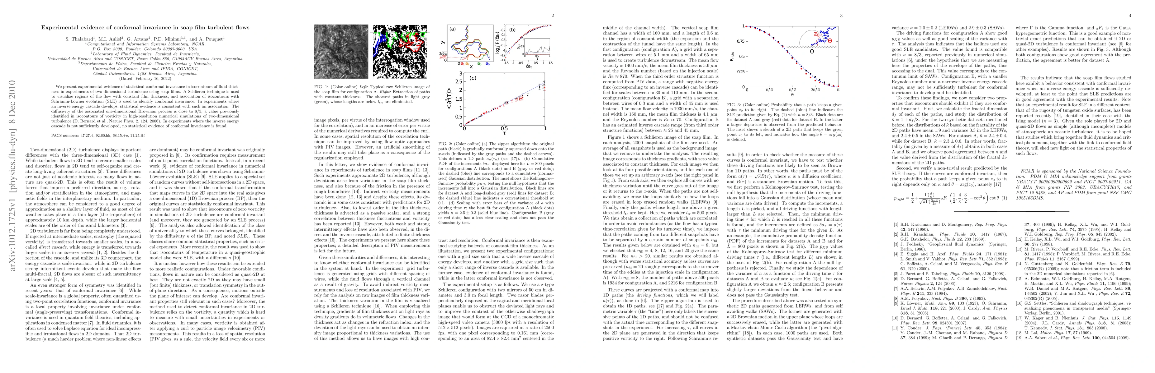 This paper provides experimental evidence supporting statistical conformal invariance in soap film turbulent flows, using Schlieren visualization and associating isocontours with Schramm-Löwner evolution (SLE). The study finds that in developed inverse energy cascades, the diffusivity aligns with previous numerical simulations.
