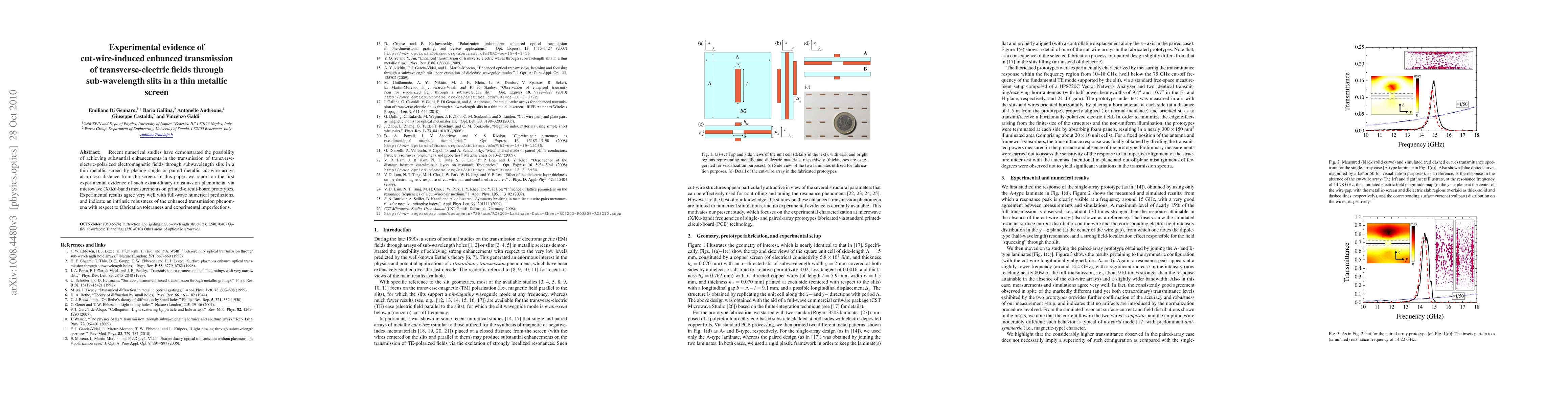This paper presents experimental evidence confirming the substantial enhancement of transverse-electric field transmission through sub-wavelength slits in metallic screens, facilitated by nearby cut-wire arrays, as predicted by numerical simulations. The results from microwave measurements on PCB prototypes align closely with numerical predictions, demonstrating the robustness of the phenomenon.