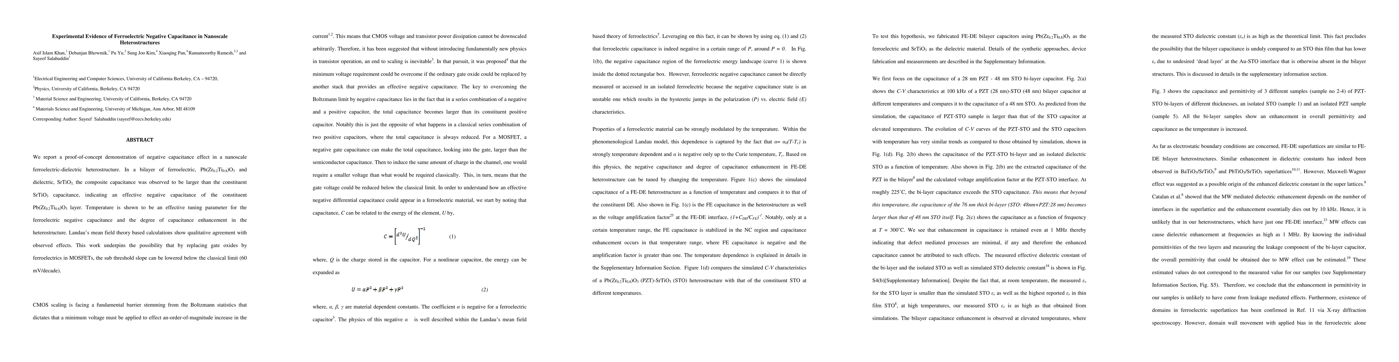 This paper demonstrates the first experimental evidence of negative capacitance in nanoscale ferroelectric-dielectric heterostructures, specifically in a Pb(Zr0.2Ti0.8)O3/SrTiO3 bilayer, showing enhanced composite capacitance. The findings suggest potential for reducing subthreshold slope in MOSFETs by using ferroelectric materials.