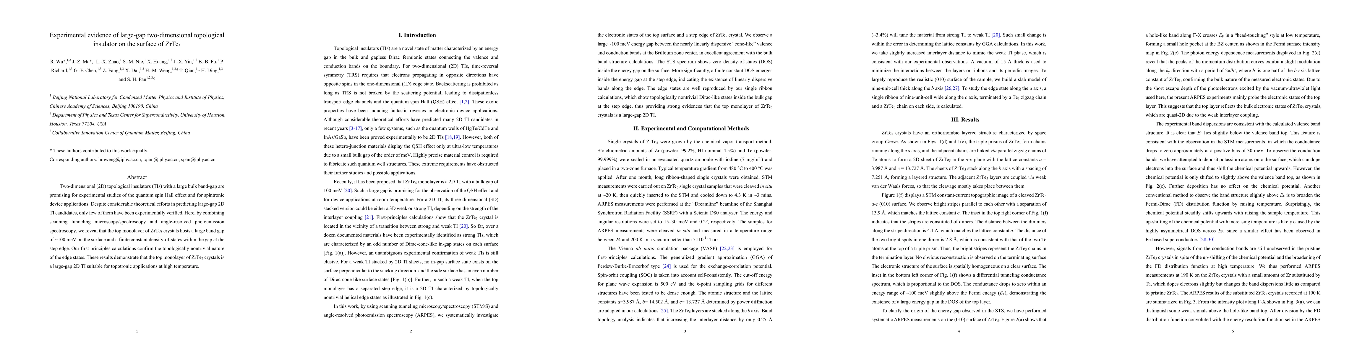 This paper experimentally verifies the existence of a large-gap two-dimensional topological insulator on the surface of ZrTe5 using scanning tunneling microscopy and angle-resolved photoemission spectroscopy, confirming its suitability for spintronic applications. Theoretical calculations support the topologically nontrivial nature of the edge states.