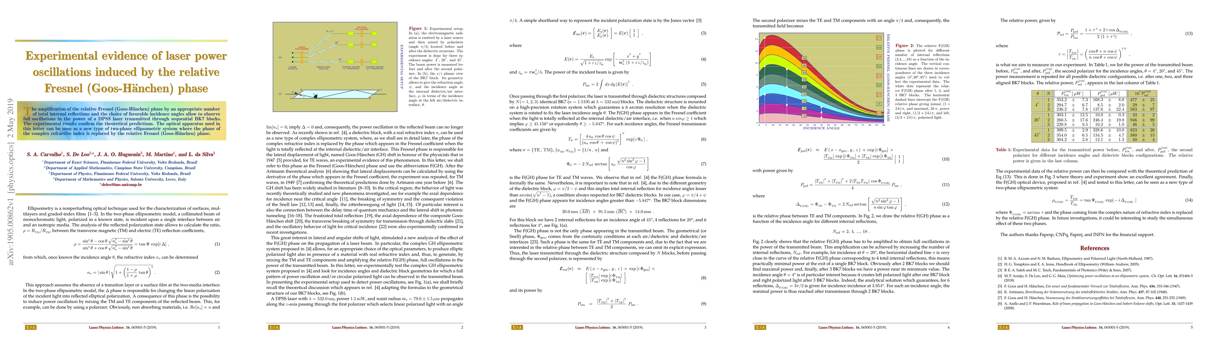 This paper presents experimental evidence of laser power oscillations induced by the relative Fresnel (Goos-Haenchen) phase through sequential BK7 blocks, confirming theoretical predictions. The study introduces a novel two-phase ellipsometric system based on these phase oscillations.