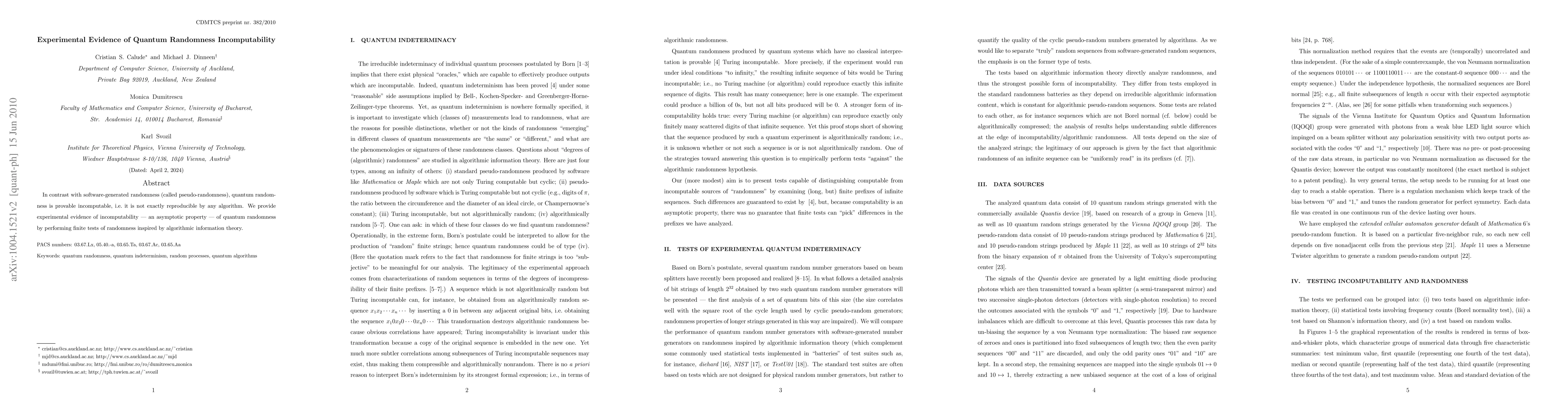 This paper experimentally demonstrates the incomputability of quantum randomness, showing it cannot be exactly replicated by any algorithm, using finite tests rooted in algorithmic information theory. The findings highlight the unique and irreducible nature of quantum randomness.