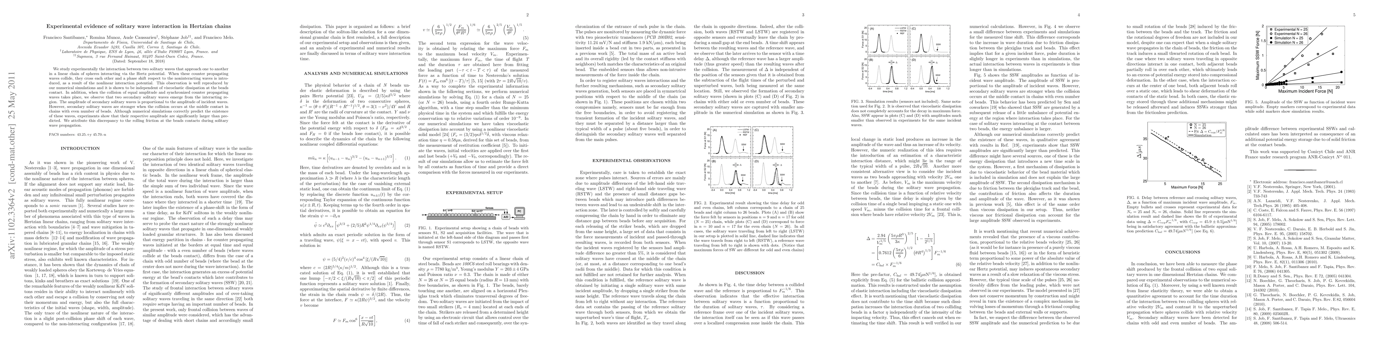 This paper experimentally investigates the interaction of solitary waves in Hertzian chains, finding that colliding waves introduce a phase shift due to nonlinear interactions. Numerical simulations match these observations, but experimental results show larger secondary wave amplitudes, likely due to rolling friction.