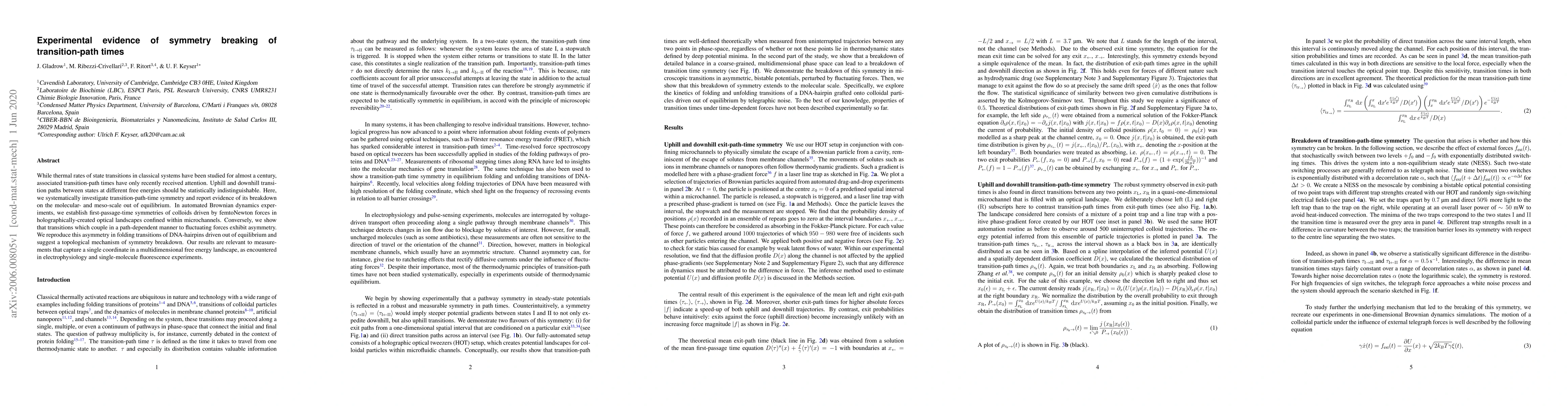 While Kramers' rates have been studied for almost a century, the transition path time between states has only recently received attention. Transition paths between different energy levels are expected to be indistinguishable in shape and have equal uphill and downhill lengths. This fundamental symmetry often prevents directional sensing in experiments. Here, we report experimental evidence for transition path time symmetry and its breakdown on the single-molecule and mesoscale. In automated Brownian dynamics experiments, we establish first-passage time symmetries of colloids driven by femtoNewton-range forces in holographically-created optical landscapes confined in microchannels. Conversely, we show that transitions which couple in a path-dependent manner to fluctuating forces exhibit asymmetry. We reproduce this asymmetry in folding transitions of DNA-hairpins driven out of equilibrium and suggest a topological mechanism for the symmetry breakdown. Our results can reveal directionality in molecular transitions or translocations through membrane channels and nanopores.