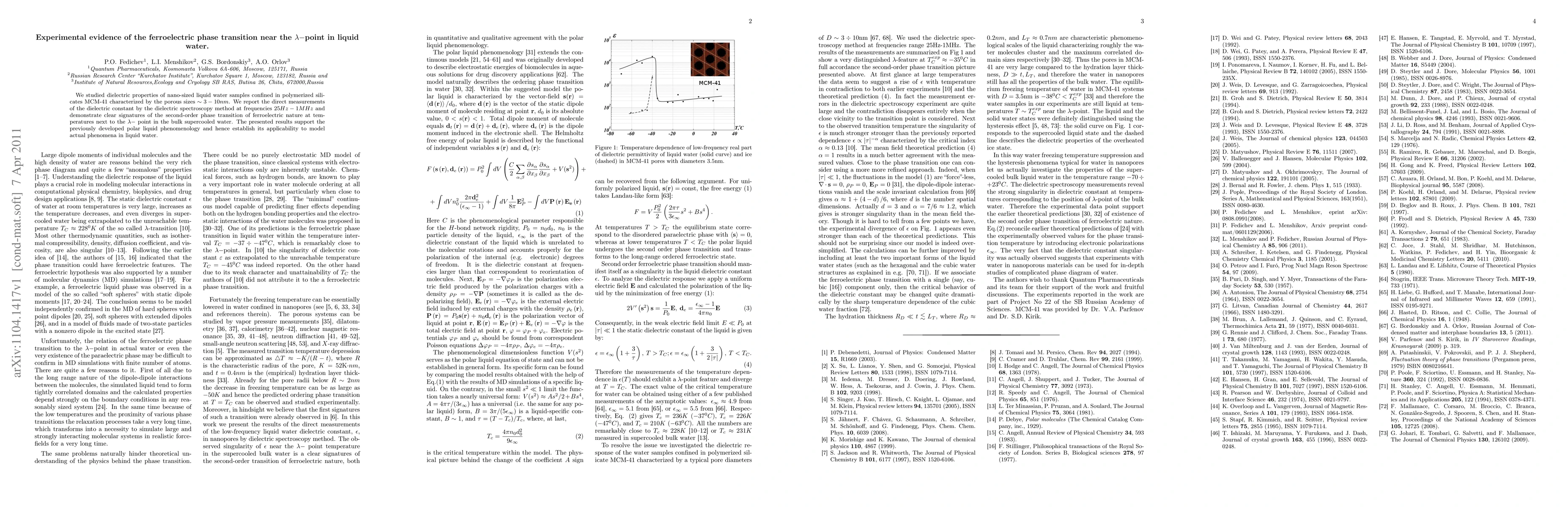 We studied dielectric properties of nano-sized liquid water samples confined in polymerized silicates MCM-41 characterized by the porous sizes \sim 3-10nm. We report the direct measurements of the dielectric constant by the dielectric spectroscopy method at frequencies 25Hz-1MHz and demonstrate clear signatures of the second-order phase transition of ferroelectric nature at temperatures next to the \lambda- point in the bulk supercooled water. The presented results support the previously developed polar liquid phenomenology and hence establish its applicability to model actual phenomena in liquid water.