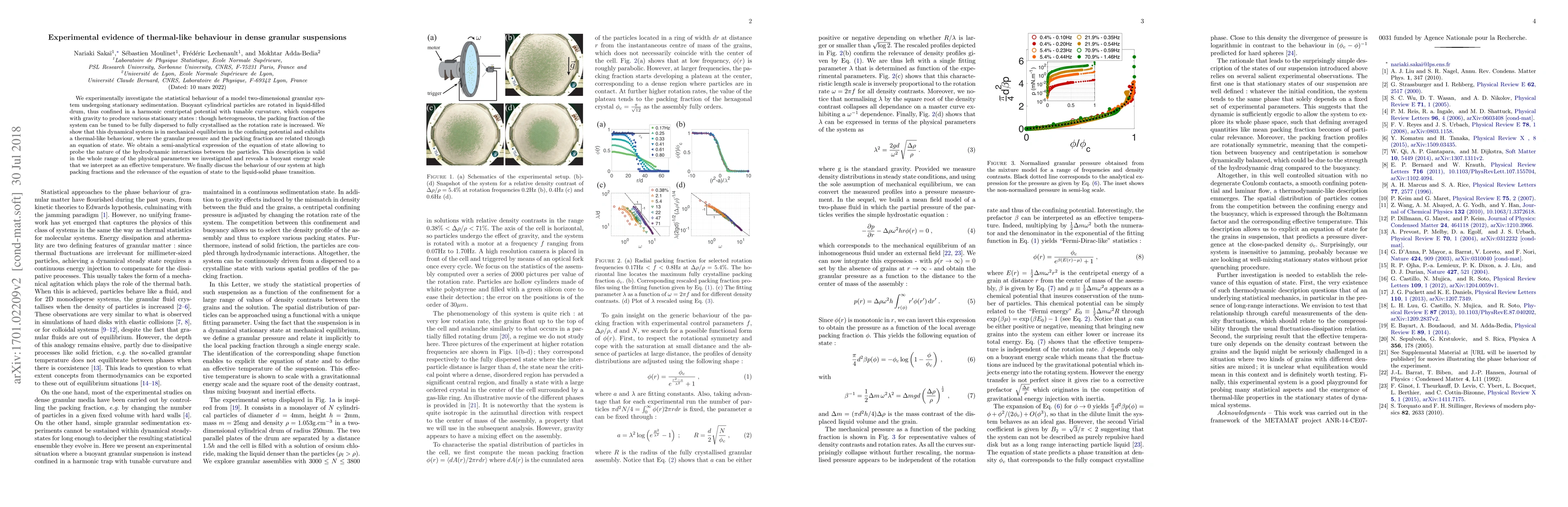 We experimentally investigate the statistical behaviour of a model two-dimensional granular system undergoing stationary sedimentation. Buoyant cylindrical particles are rotated in liquid-filled drum, thus confined in a harmonic centripetal potential with tunable curvature, which competes with gravity to produce various stationary states: though heterogeneous, the packing fraction of the system can be tuned to be fully dispersed to fully crystallised as the rotation rate is increased. We show that this dynamical system is in mechanical equilibrium in the confining potential and exhibits a thermal-like behaviour, where the granular pressure and the packing fraction are related through an equation of state. We obtain a semi-analytical expression of the equation of state allowing to probe the nature of the hydrodynamic interactions between the particles. This description is valid in the whole range of the physical parameters we investigated and reveals a buoyant energy scale that we interpret as an effective temperature. We finally discuss the behaviour of our system at high packing fractions and the relevance of the equation of state to the liquid-solid phase transition.
