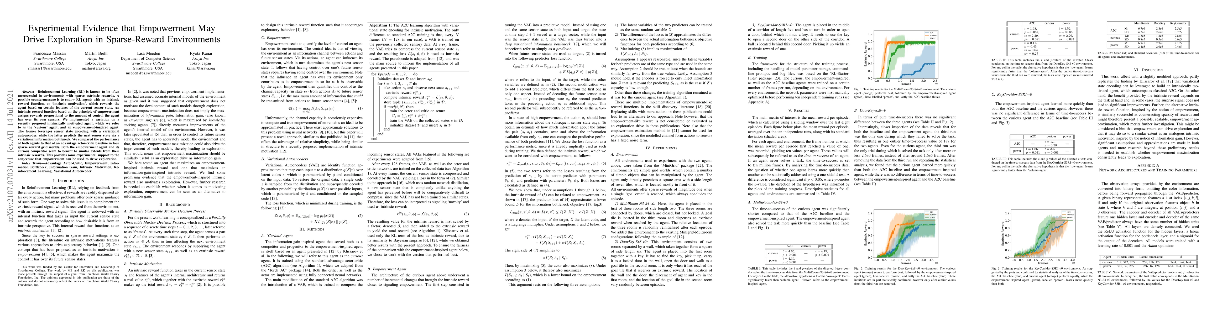 Reinforcement Learning (RL) is known to be often unsuccessful in environments with sparse extrinsic rewards. A possible countermeasure is to endow RL agents with an intrinsic reward function, or 'intrinsic motivation', which rewards the agent based on certain features of the current sensor state. An intrinsic reward function based on the principle of empowerment assigns rewards proportional to the amount of control the agent has over its own sensors. We implemented a variation on a recently proposed intrinsically motivated agent, which we refer to as the 'curious' agent, and an empowerment-inspired agent. The former leverages sensor state encoding with a variational autoencoder, while the latter predicts the next sensor state via a variational information bottleneck. We compared the performance of both agents to that of an advantage actor-critic baseline in four sparse reward grid worlds. Both the empowerment agent and its curious competitor seem to benefit to similar extents from their intrinsic rewards. This provides some experimental support to the conjecture that empowerment can be used to drive exploration.