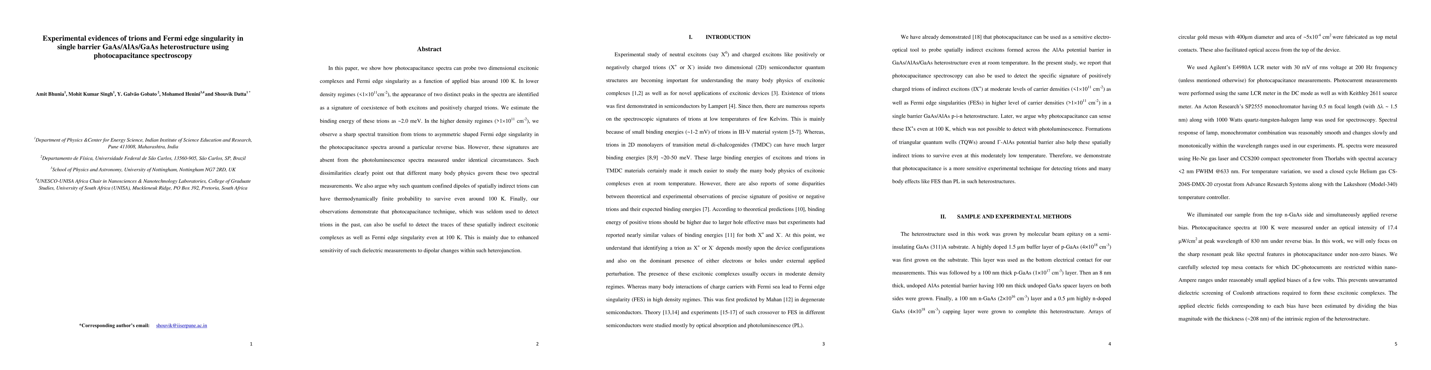 This paper demonstrates the use of photocapacitance spectroscopy to detect trions and Fermi edge singularity in GaAs/AlAs/GaAs heterostructures at ~100 K. It reveals distinct peaks in lower density regimes indicating excitons and trions, with a trion binding energy of ~2.0 meV, while higher density regimes show a transition to Fermi edge singularity under reverse bias, highlighting different many-body physics in spectral measurements.