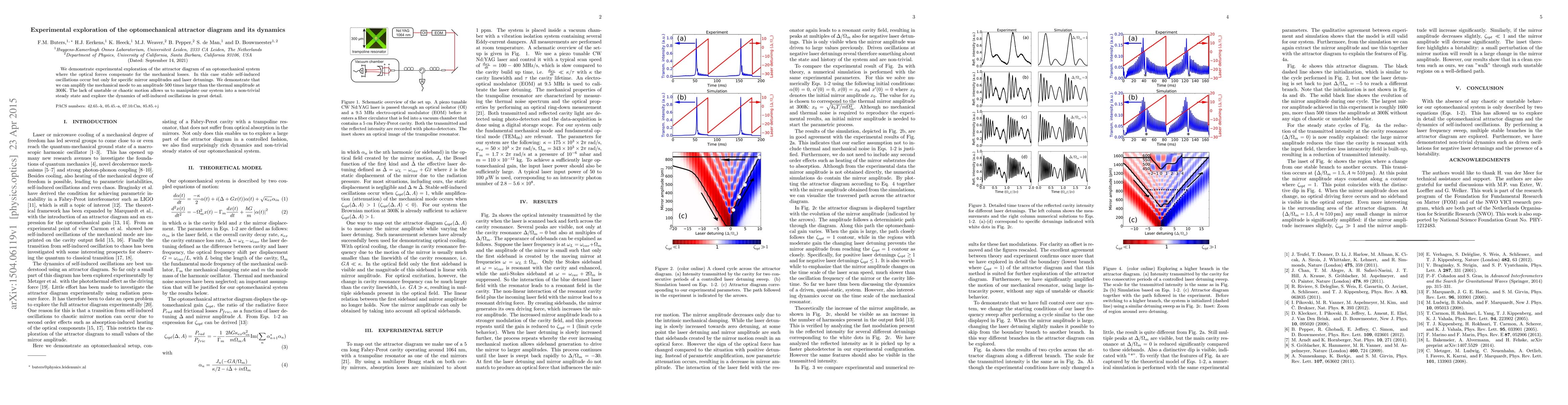 We demonstrate experimental exploration of the attractor diagram of an optomechanical system where the optical forces compensate for the mechanical losses. In this case stable self-induced oscillations occur but only for specific mirror amplitudes and laser detunings. We demonstrate that we can amplify the mechanical mode to an amplitude 500 times larger than the thermal amplitude at 300K. The lack of unstable or chaotic motion allows us to manipulate our system into a non-trivial steady state and explore the dynamics of self-induced oscillations in great detail.