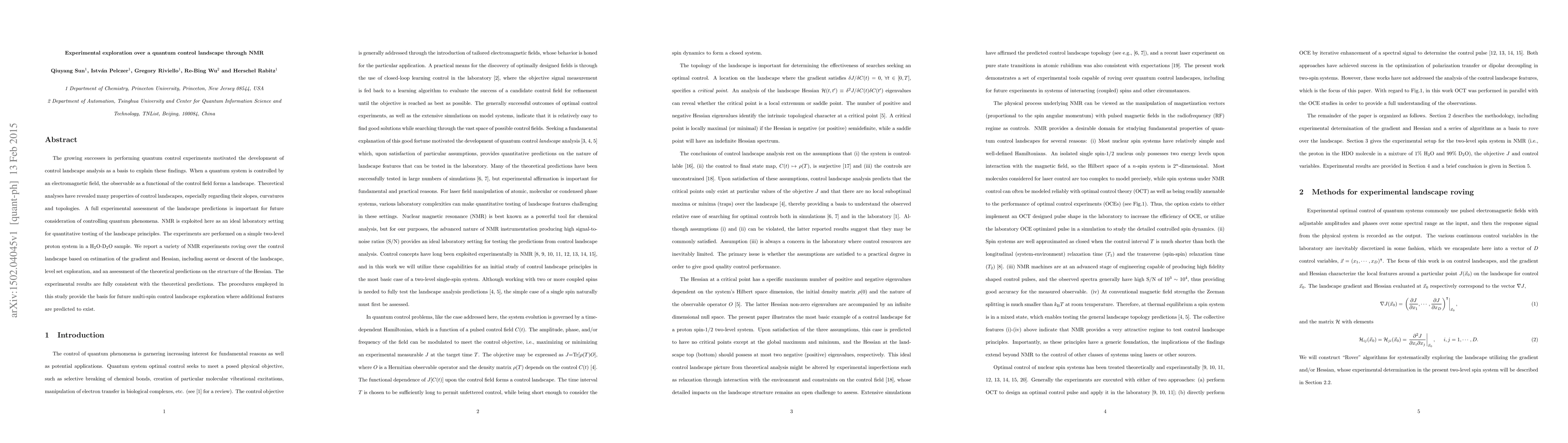This paper explores quantum control landscapes using nuclear magnetic resonance (NMR) on a two-level proton system in H$_2$O-D$_2$O, performing experiments to test theoretical predictions about landscape gradients and Hessians. The results confirm theoretical models, laying the groundwork for future multispin NMR experiments.