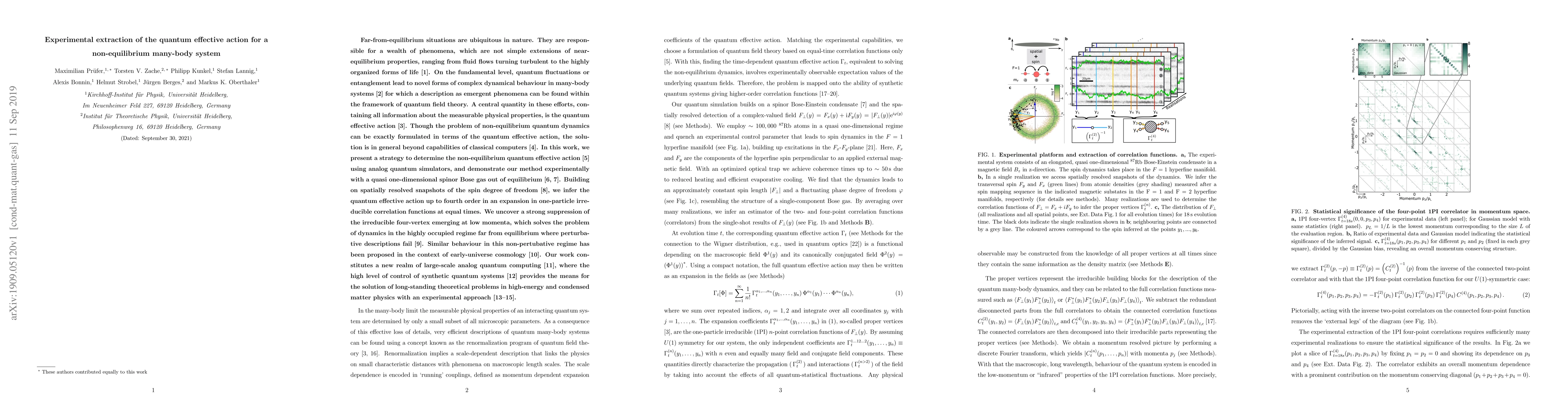 This paper presents an experimental method to extract the quantum effective action for non-equilibrium many-body systems using analog quantum simulators. The authors demonstrate their approach with a quasi one-dimensional spinor Bose gas, revealing a suppression of the four-vertex interaction at low momenta, which resolves dynamics in highly occupied regimes where perturbative methods fail.