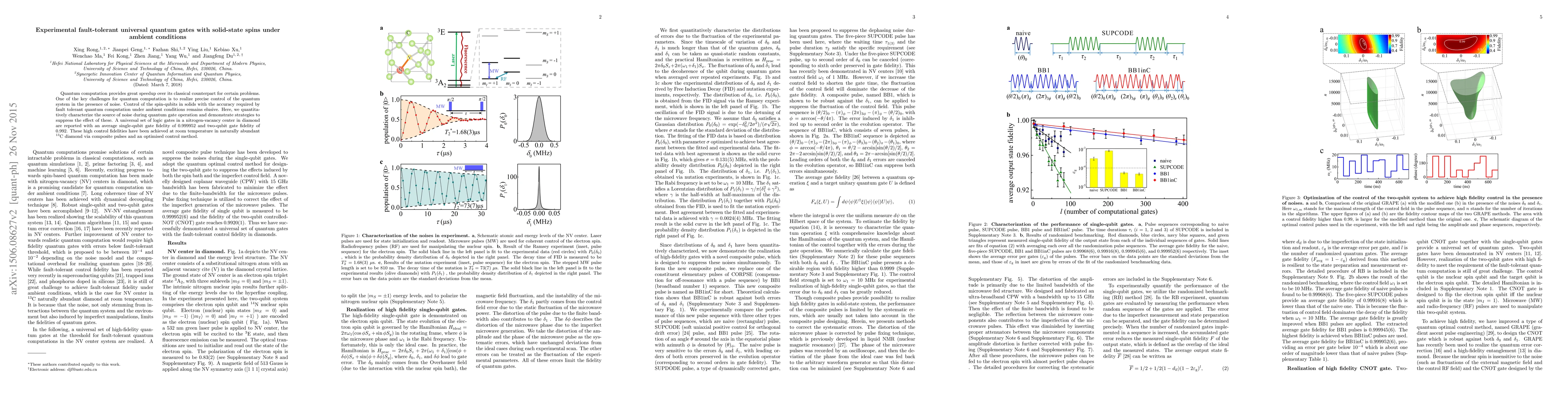 This paper reports the development of fault-tolerant universal quantum gates using nitrogen-vacancy centres in diamond at room temperature, achieving high fidelity qubit operations through noise suppression and optimized control methods. The demonstrated single-qubit gate fidelity is 0.999952, and two-qubit gate fidelity is 0.992, marking significant progress towards practical quantum computing.