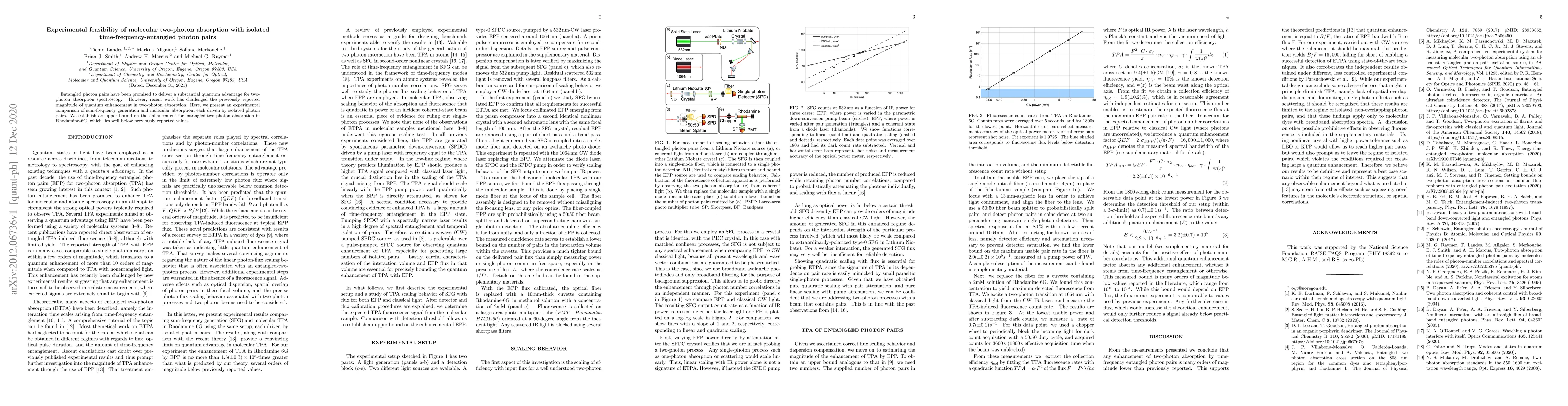 This research experimentally assesses the feasibility of quantum enhancement in two-photon absorption using isolated time-frequency-entangled photon pairs, finding that the enhancement for entangled-two-photon absorption in Rhodamine-6G is significantly lower than previously reported values.