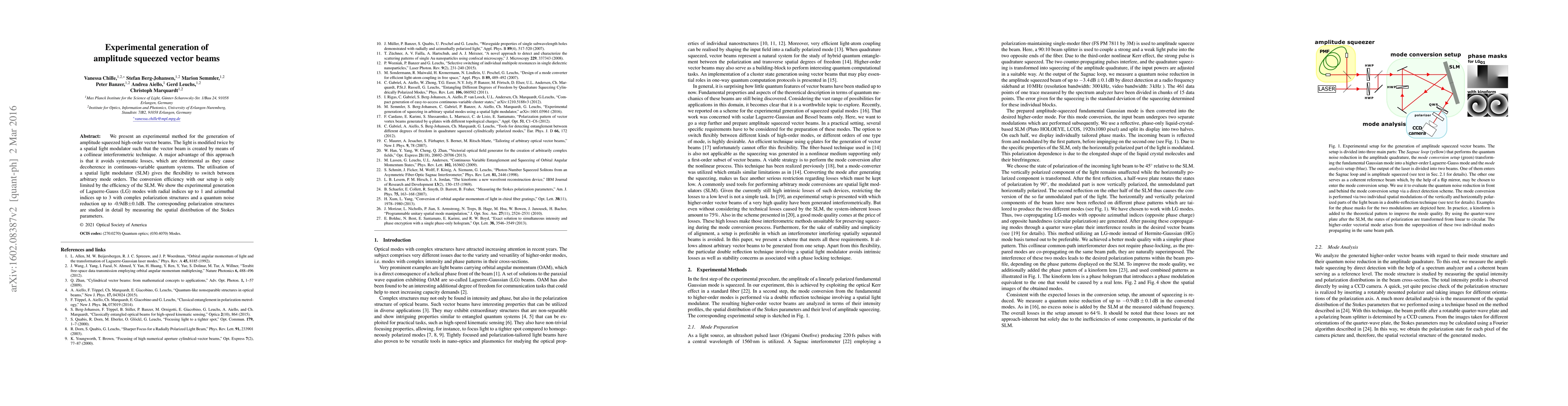 This paper details an experimental method for generating high-order vector beams with amplitude squeezing using a spatial light modulator. The technique avoids systematic losses, enabling quantum noise reduction up to -0.9dB, and allows flexibility in switching between different mode orders.