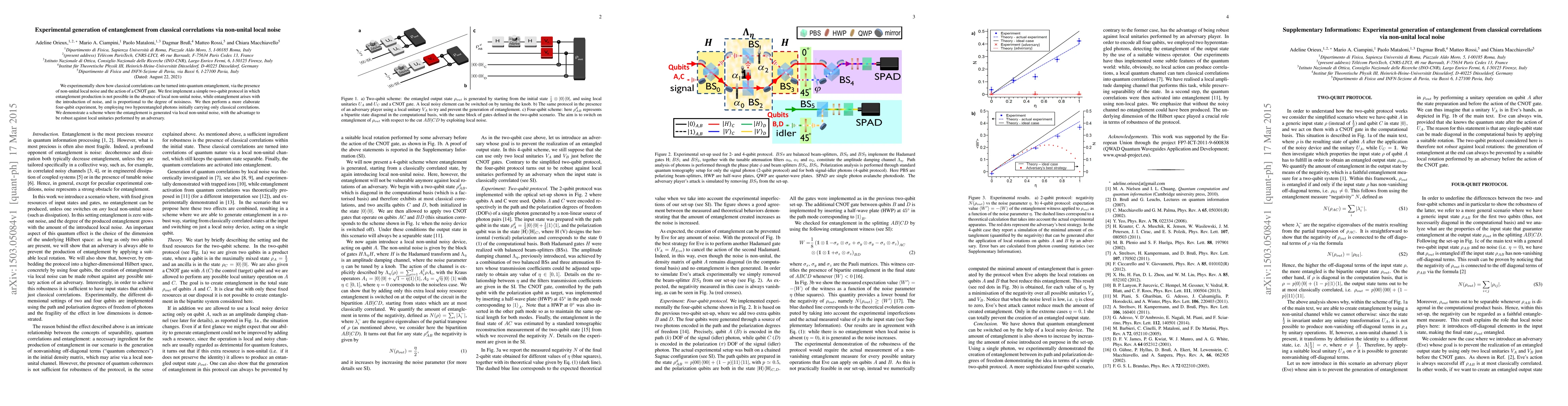 The paper presents an experimental demonstration of converting classical correlations to entanglement using non-unital local noise and a CNOT gate, showcasing a novel approach to entanglement generation that is robust against adversarial local unitaries.