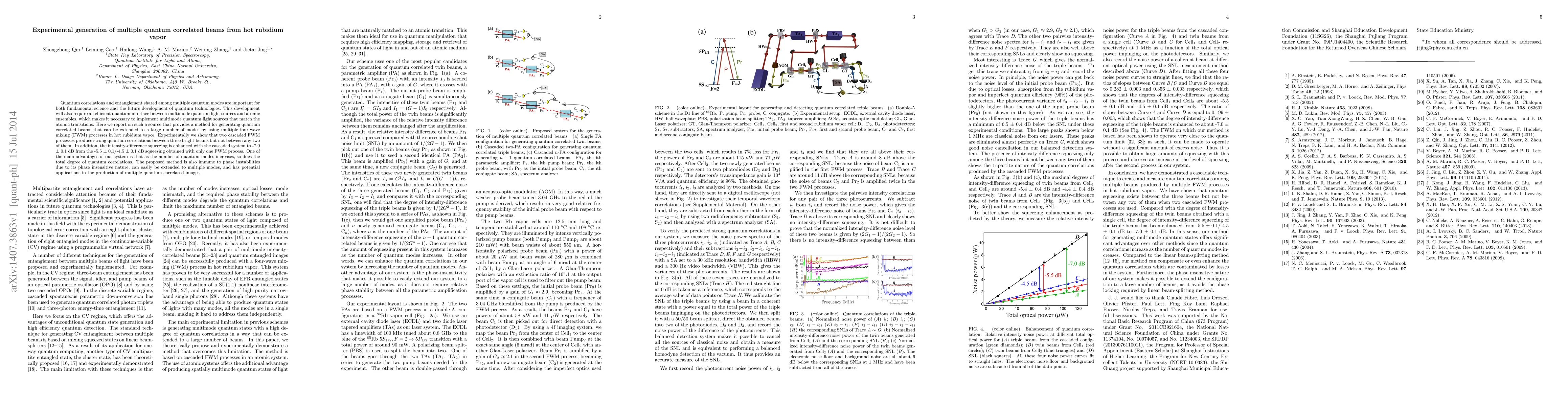Quantum correlations and entanglement shared among multiple quantum modes are important for both fundamental science and the future development of quantum technologies. This development will also require an efficient quantum interface between multimode quantum light sources and atomic ensembles, which makes it necessary to implement multimode quantum light sources that match the atomic transitions. Here we report on such a source that provides a method for generating quantum correlated beams that can be extended to a large number of modes by using multiple four-wave mixing (FWM) processes in hot rubidium vapor. Experimentally we show that two cascaded FWM processes produce strong quantum correlations between three bright beams but not between any two of them. In addition, the intensity-difference squeezing is enhanced with the cascaded system to -7.0 $\pm$ 0.1 dB from the -5.5 $\pm$ 0.1/-4.5 $\pm$ 0.1 dB squeezing obtained with only one FWM process. One of the main advantages of our system is that as the number of quantum modes increases, so does the total degree of quantum correlations. The proposed method is also immune to phase instabilities due to its phase insensitive nature, can easily be extended to multiple modes, and has potential applications in the production of multiple quantum correlated images.