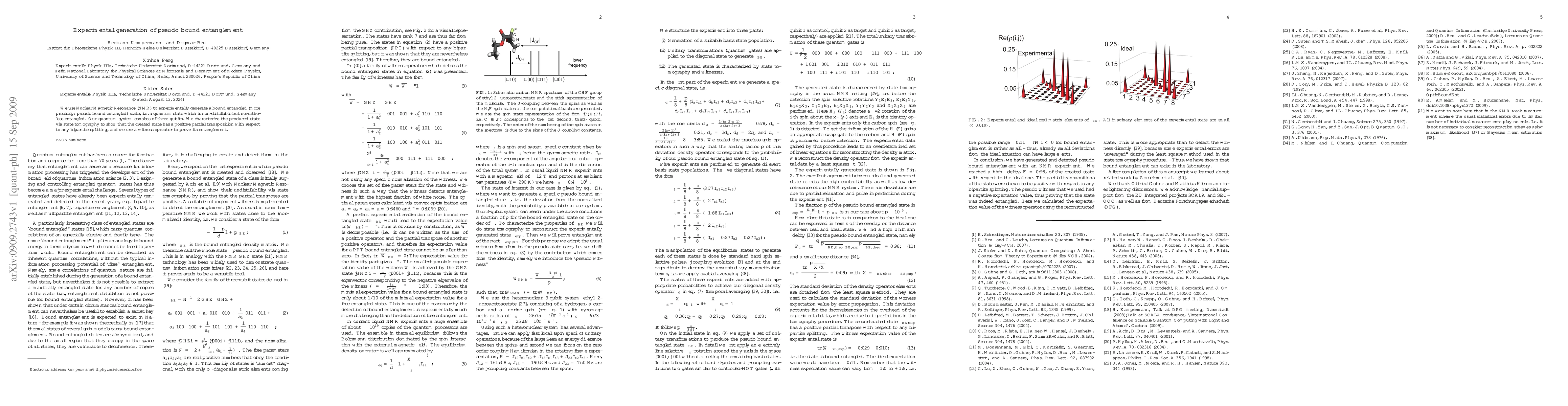 This paper experimentally generates a pseudo bound entangled state using NMR with three qubits, demonstrating a non-distillable yet entangled state via state tomography and a witness operator. The state exhibits a positive partial transposition for any bipartite splitting.