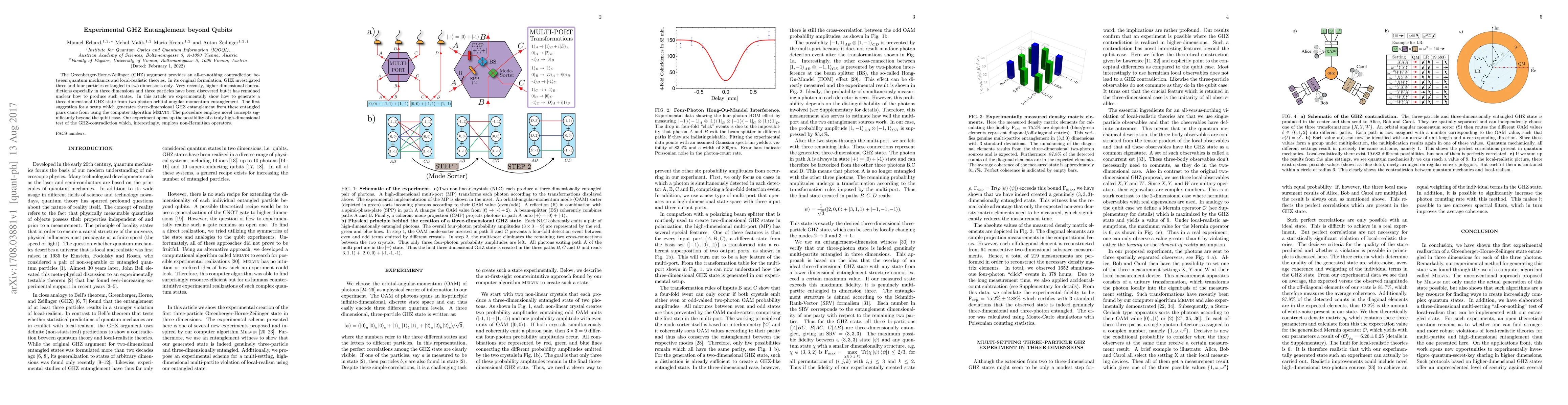 The Greenberger-Horne-Zeilinger (GHZ) argument provides an all-or-nothing contradiction between quantum mechanics and local-realistic theories. In its original formulation, GHZ investigated three and four particles entangled in two dimensions only. Very recently, higher dimensional contradictions especially in three dimensions and three particles have been discovered but it has remained unclear how to produce such states. In this article we experimentally show how to generate a three-dimensional GHZ state from two-photon orbital-angular-momentum entanglement. The first suggestion for a setup which generates three-dimensional GHZ entanglement from these entangled pairs came from using the computer algorithm Melvin. The procedure employs novel concepts significantly beyond the qubit case. Our experiment opens up the possibility of a truly high-dimensional test of the GHZ-contradiction which, interestingly, employs non-Hermitian operators.