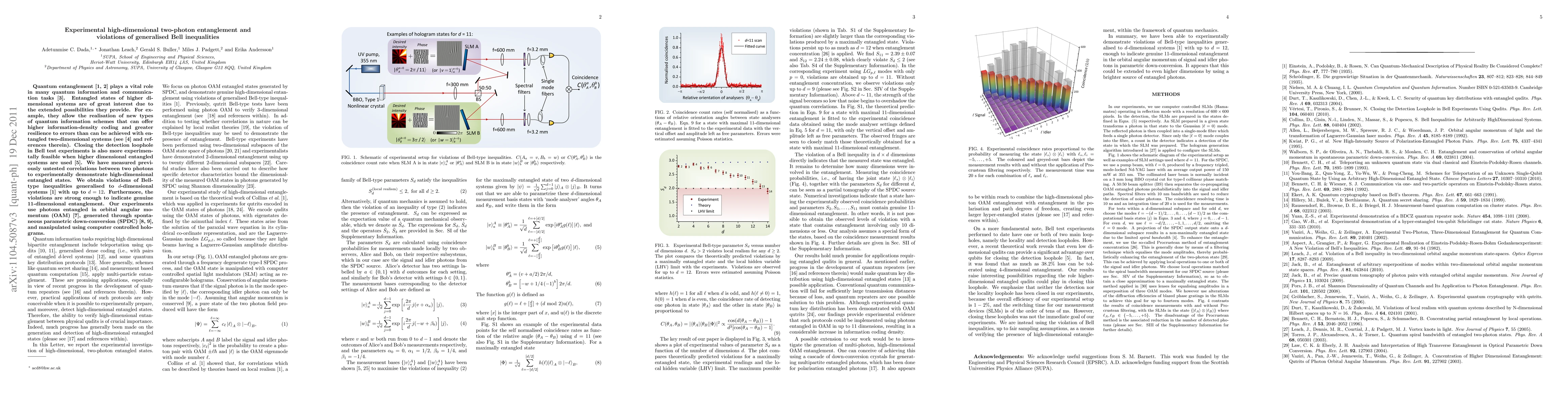 This paper demonstrates experimentally high-dimensional two-photon entanglement and violations of generalised Bell inequalities, showing genuine 11-dimensional entanglement. The study uses photons entangled in orbital angular momentum, generated via spontaneous parametric down-conversion, and manipulated with computer-controlled holograms.