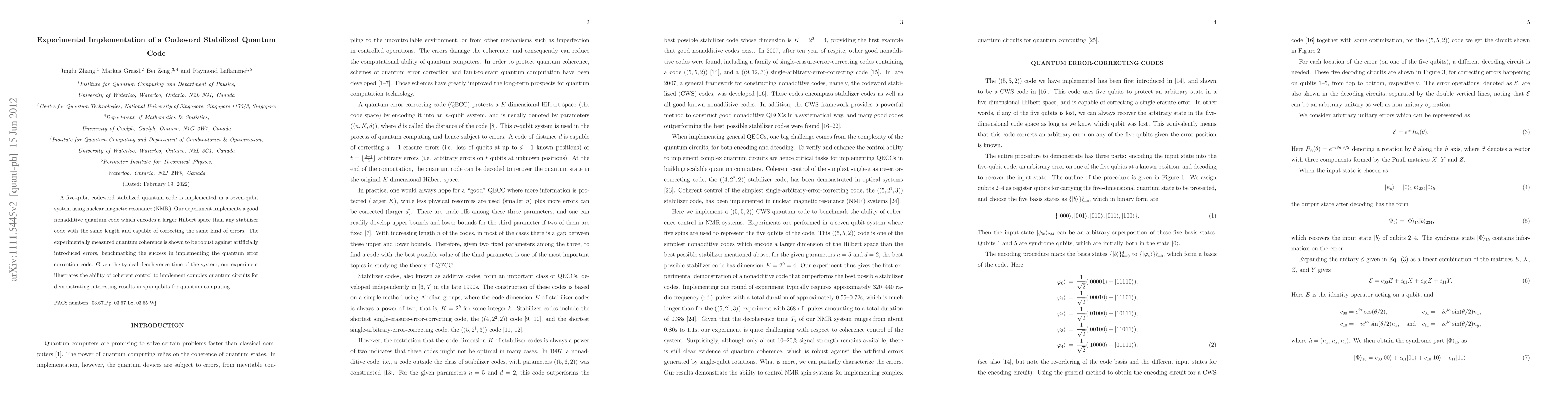 This paper details the experimental implementation of a five-qubit codeword stabilized quantum code in a seven-qubit NMR system, demonstrating robust quantum coherence against errors and showcasing the potential for complex quantum circuits in spin qubits for quantum computing. The code encodes a larger Hilbert space than comparable stabilizer codes and successfully corrects errors.