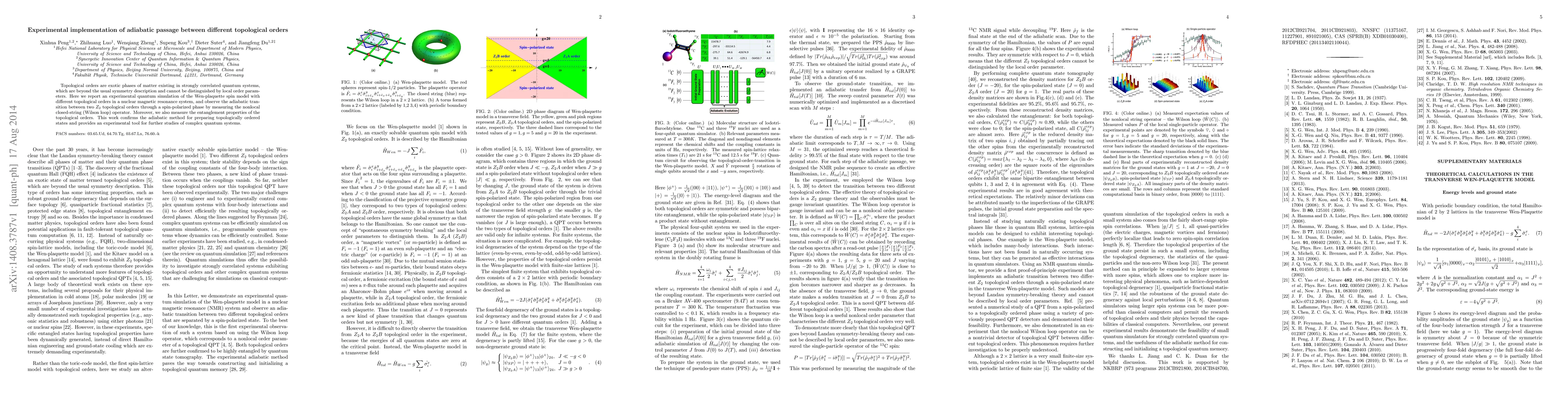 This paper reports a quantum simulation of the Wen-plaquette spin model in an NMR system, demonstrating adiabatic passage between two $Z_2$ topological orders. The study measures the nonlocal Wilson loop operator and entanglement properties, confirming the adiabatic method for preparing topologically ordered states.