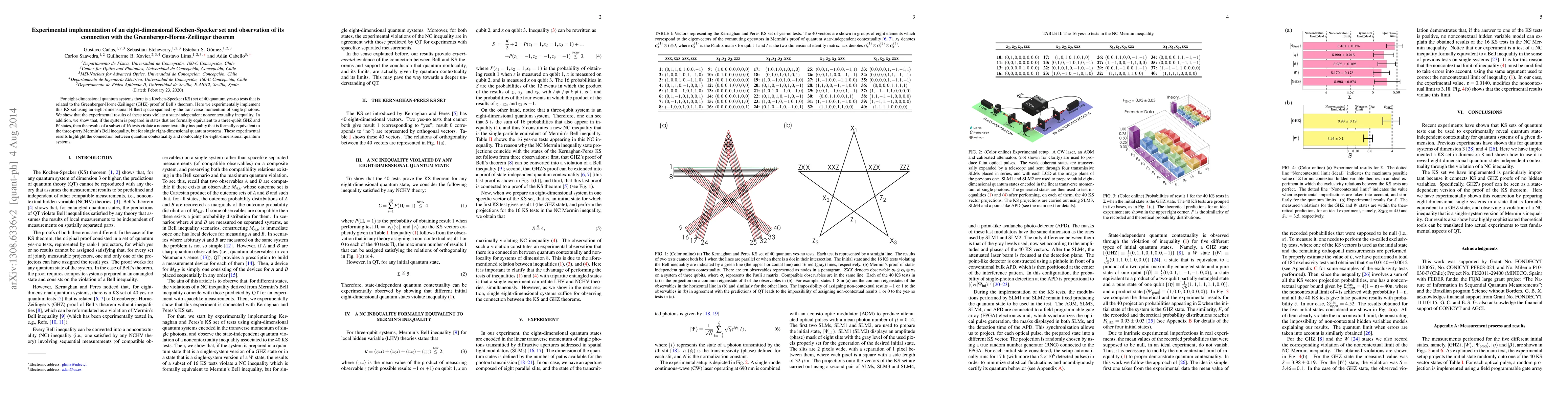 For eight-dimensional quantum systems there is a Kochen-Specker (KS) set of 40 quantum yes-no tests that is related to the Greenberger-Horne-Zeilinger (GHZ) proof of Bell's theorem. Here we experimentally implement this KS set using an eight-dimensional Hilbert space spanned by the transverse momentum of single photons. We show that the experimental results of these tests violate a state-independent noncontextuality inequality. In addition, we show that, if the system is prepared in states that are formally equivalent to a three-qubit GHZ and $W$ states, then the results of a subset of 16 tests violate a noncontextuality inequality that is formally equivalent to the three-party Mermin's Bell inequality, but for single eight-dimensional quantum systems. These experimental results highlight the connection between quantum contextuality and nonlocality for eight-dimensional quantum systems.