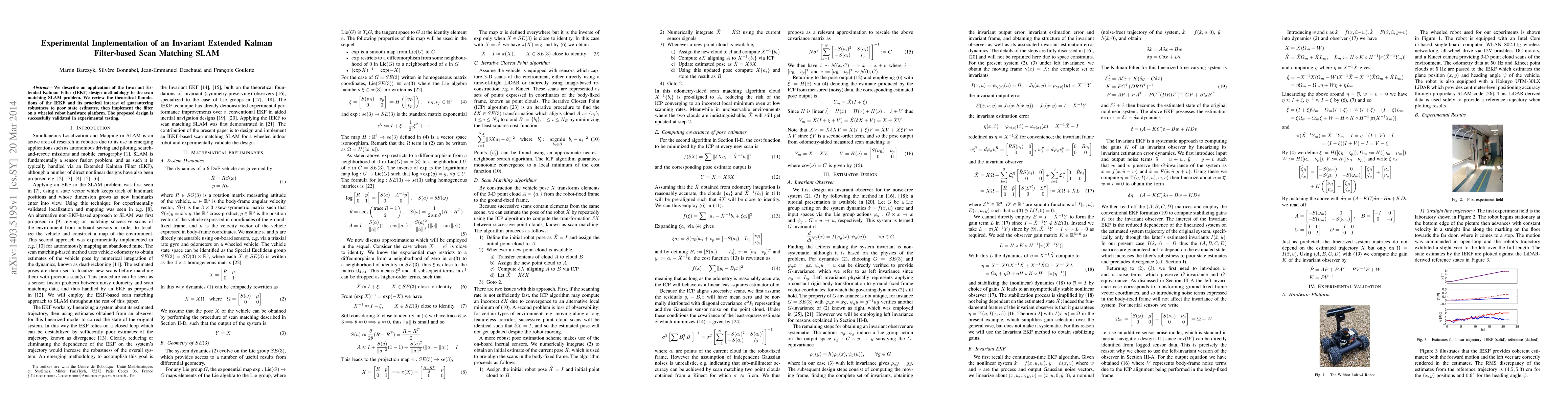 This paper applies an Invariant Extended Kalman Filter (IEKF) to scan matching SLAM, ensuring robustness against poor state estimates, and validates the methodology through experiments on a wheeled robot platform. The implementation demonstrates successful performance in real-world testing.