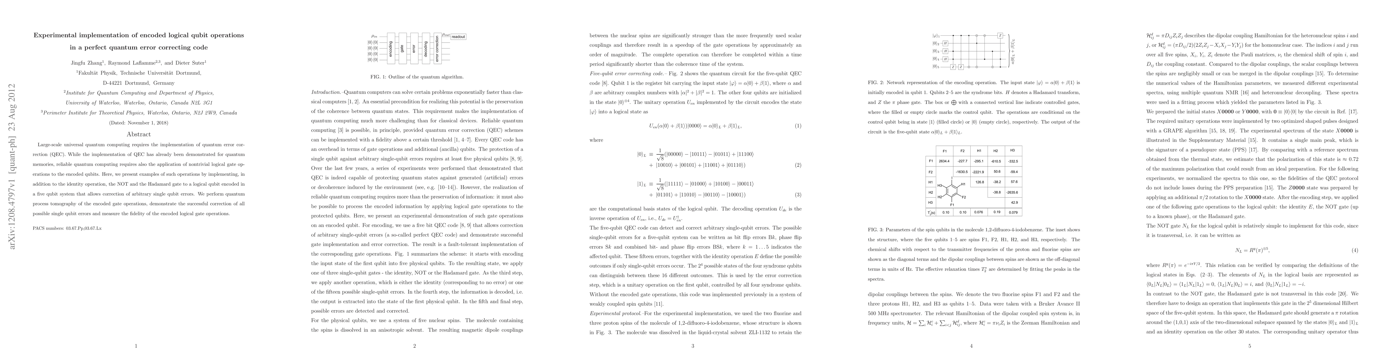 This paper demonstrates the implementation of encoded logical qubit operations, including NOT and Hadamard gates, within a five-qubit perfect quantum error correcting code. The study successfully corrects all single-qubit errors and measures the fidelity of these operations through quantum process tomography.