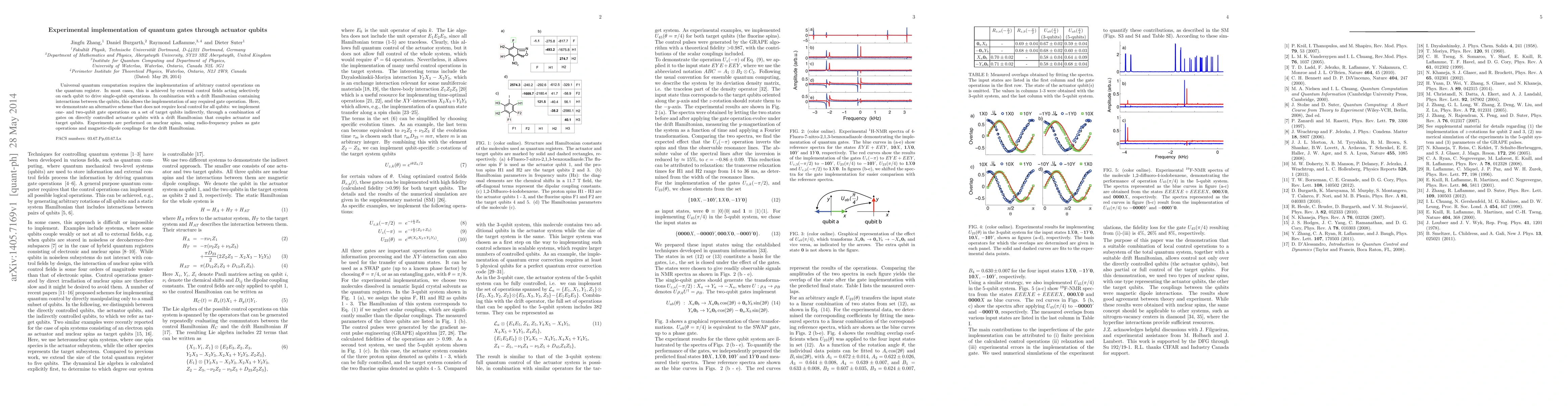 This paper presents an experimental scheme for implementing quantum gates using actuator qubits to indirectly control target qubits, without requiring local control for all qubits. The method employs radio-frequency pulses and magnetic-dipole couplings to achieve one- and two-qubit gate operations on nuclear spins.